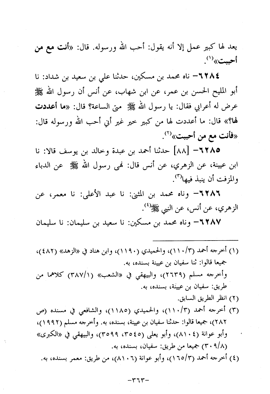 6284- حَدَّثَناه مُحَمد بْنُ مِسْكِينٍ حَدَّثنا عَلِيُّ بْنُ سَعِيد بن شداد، حَدَّثنا أَبُو الْمَلِيحِ الْحَسَنُ بْنُ عُمَر، عَن ابْنِ شِهاب، عَن أَنَسٍ أَنَّ رَسُولَ اللهِ صَلَّى اللَّهُ عَلَيه وَسَلَّم عَرَضَ لَهُ أَعْرَابِيٌّ فَقَالَ: يا رَسولَ اللهِ مَتَى السَّاعَةُ؟ قَالَ: مَا أَعْدَدْتَ لَهَا؟ قَالَ مَا أَعْدَدْتُ لَهَا مِنْ كَبِيرِ خَيْرٍ غَيْرَ أَنِّي أُحِبُّ اللَّهَ وَرَسُولَهُ قَالَ: فَأَنْتَ مَعَ من أحببت.