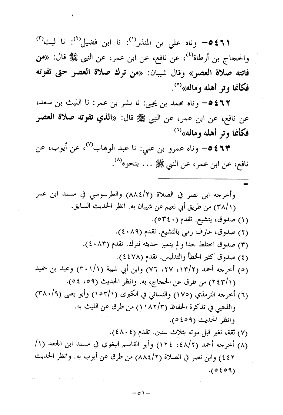 5461- وحَدَّثناه علي بن المنذر، حَدَّثنا ابن فضيل، حَدَّثنا لَيْثٌ وَالْحَجَّاجُ بْنُ أَرْطَاةَ، عَن نافعٍ، عَن ابْنِ عُمَر، عَن النَّبِيّ صَلَّى اللَّهُ عَلَيه وَسَلَّم قَالَ: مَنْ فَاتَتْهُ صَلاَةُ الْعَصْرِ، وَقال شَيْبَانُ: مَنْ تَرَكَ صَلاةَ الْعَصْرِ حَتَّى تَفُوتَهُ، فَكَأَنَّمَا وُتِرَ أَهْلَهُ وَمَالَهُ.