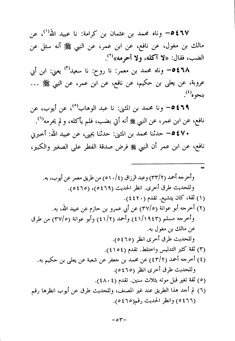 5469- وحَدَّثنا مُحَمَّدُ بْنَ الْمُثَنَّى، حَدَّثنا عَبد الوَهَّاب، عَن أَيُّوبَ، عَن نافعٍ، عَن ابْنِ عُمَر، عَن النَّبِيّ صَلَّى اللَّهُ عَلَيه وَسَلَّم؛ أَنَّه أُتِيَ بِضَبٍّ فَلَمْ يَأْكُلْهُ وَلَمْ يُحَرِّمْهُ.