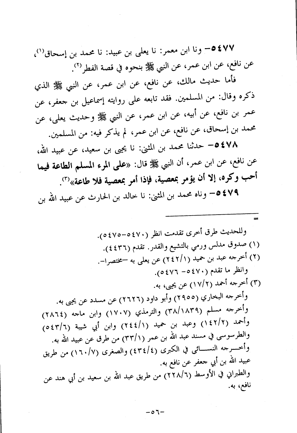 5478- حَدَّثنا مُحَمَّدُ بْنَ الْمُثَنَّى، حَدَّثنا يَحْيَى بْنُ سَعِيد، عَن عُبَيد اللَّهِ، عَن نافعٍ، عَن ابْنِ عُمَر؛ أَن النَّبِيّ صَلَّى اللَّهُ عَلَيه وَسَلَّم قَالَ: عَلَى الْمَرْءِ الْمُسْلِمِ الطَّاعَةُ فِيمَا أَحَبَّ وَكَرِهَ إلاَّ أَنْ يُؤْمَرَ بمعصية فإذا أمر بمعصية فلا طاعة.