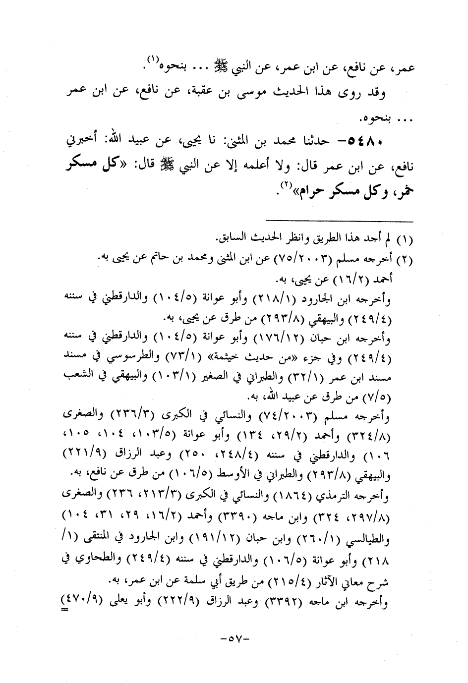 5480- حَدَّثنا مُحَمَّدُ بْنَ الْمُثَنَّى، حَدَّثنا يَحْيَى، عَن عُبَيد اللَّهِ، أَخْبَرَنِي نَافِعٍ، عَن ابْنِ عُمَر قَالَ، ولاَ أَعْلَمُهُ إلاَّ عَن النَّبِيّ صَلَّى اللَّهُ عَلَيه وَسَلَّم قَالَ: كُلُّ مُسْكِرٍ خَمْرٌ، وكُلُّ مُسْكِرٍ حَرَامٌ.