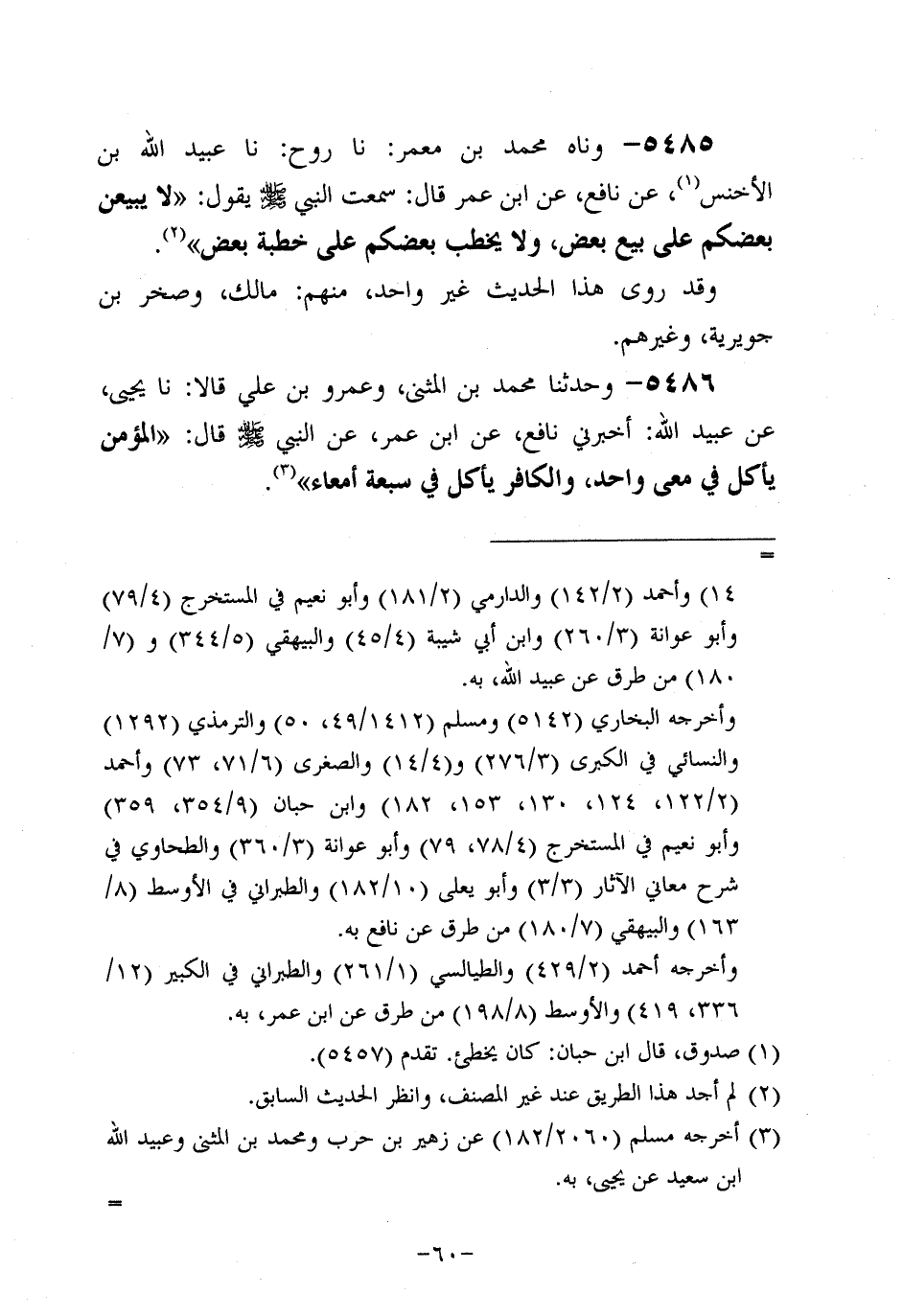 5486 - وحَدَّثنا مُحَمَّدُ بْنَ الْمُثَنَّى وَعَمْرُو بْنُ عَلِيٍّ، قالاَ: حَدَّثنا يَحْيَى، عَن عُبَيد اللَّهِ: أَخْبَرَنِي نَافِعٍ، عَن ابْنِ عُمَر، عَن النَّبِيّ صَلَّى اللَّهُ عَلَيه وَسَلَّم قَالَ: الْمُؤْمِنُ يَأْكُلُ فِي مِعًى وَاحِدٍ , وَالْكَافِرُ يَأْكُلُ فِي سَبْعَةِ أَمْعَاءٍ.
