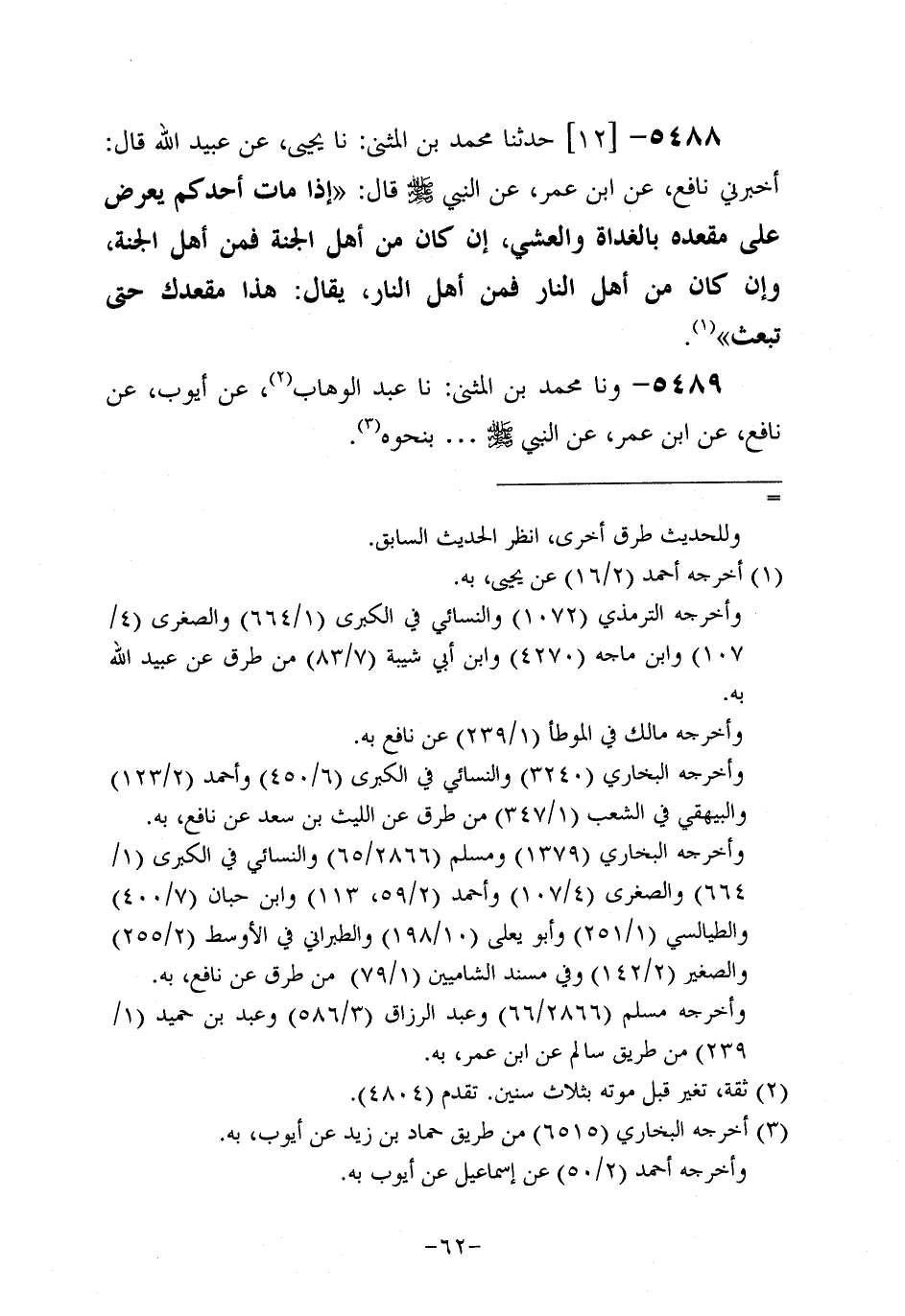 5488- حَدَّثنا مُحَمَّدُ بْنَ الْمُثَنَّى، حَدَّثنا يَحْيَى، عَن عُبَيد اللَّهِ، قَال: أَخْبَرني نَافِعٌ، عَن ابْنِ عُمَر، عَن النَّبِيّ صَلَّى اللَّهُ عَلَيه وَسَلَّم قَالَ: إِذَا مَاتَ أَحَدُكُمْ يُعْرَضُ عَلَى مَقْعَدِهِ بِالْغَدَاةِ وَالْعِشِيِّ إِنْ كَانَ مِنْ أَهْلِ الْجَنَّةِ فَمِنْ أَهْلِ الْجَنَّةِ، وَإن كَانَ مِنْ أَهْلِ النَّارِ فَمِنْ أَهْلِ النَّارِ يُقَالُ: هَذَا مَقْعَدُكَ حتى تبعث.