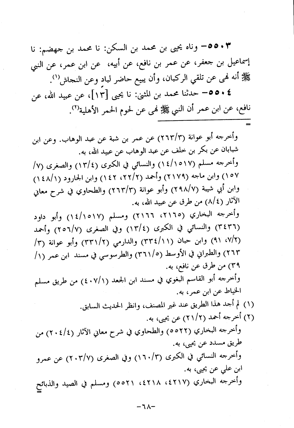 5503- وحَدَّثناه يَحْيَى بن مُحَمد بن السكن، حَدَّثنا مُحَمد بْن جَهْضَمٍ، حَدَّثَنَا إِسْمَاعِيلُ بْنُ جَعْفَرٍ، عَن عُمَر بْنِ نَافِعٍ، عَن أَبِيه، عَن ابْنِ عُمَر، عَن النَّبِيّ صَلَّى اللَّهُ عَلَيه وَسَلَّم؛ أَنَّه نَهَى عَن تَلَقِّي الرُّكْبَانِ وَأَنْ يَبِيعَ حَاضِرٌ لِبَادٍ، وعَن النِّجَاشِ.