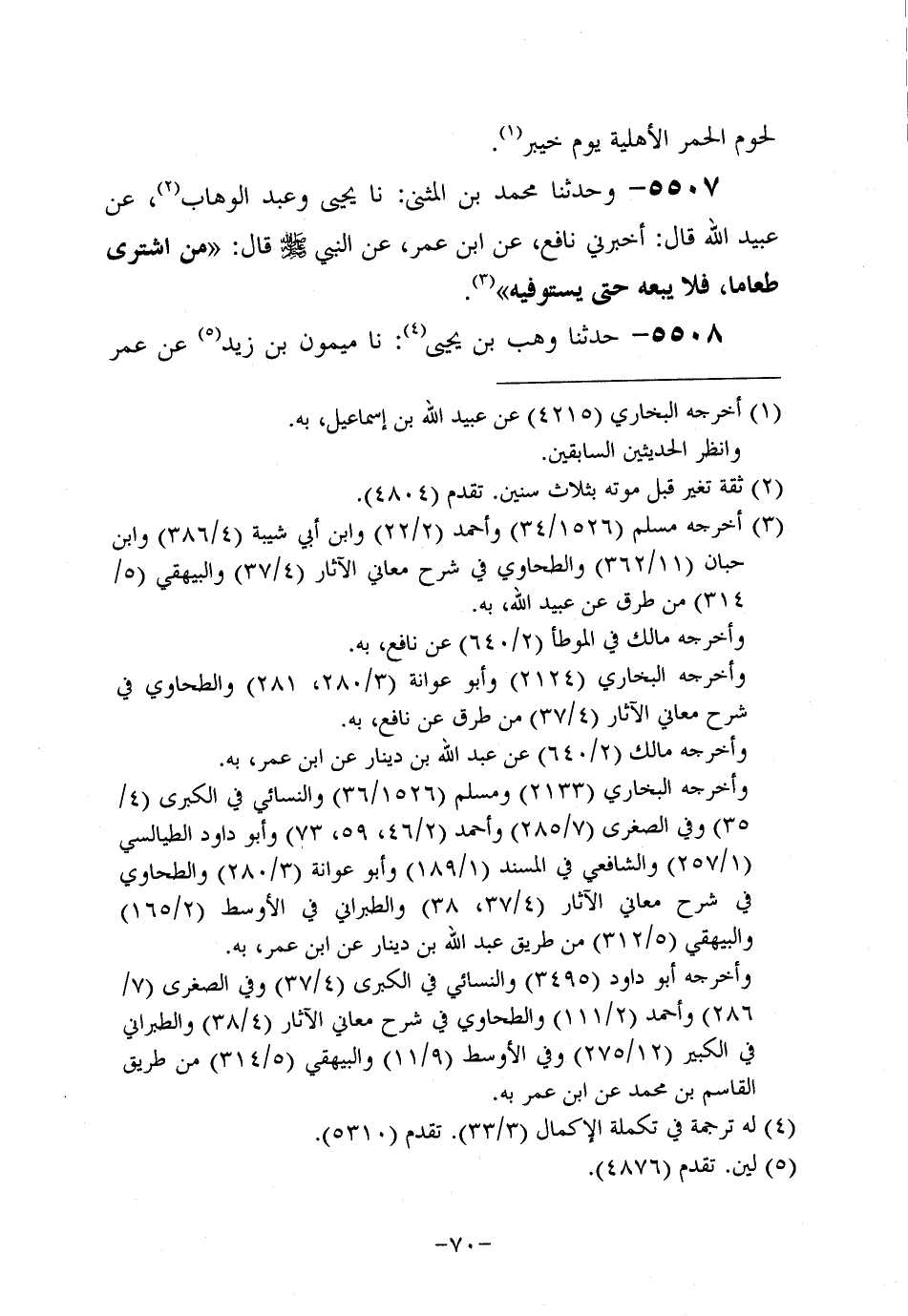 5507 - وحَدَّثنا مُحَمَّدُ بْنَ الْمُثَنَّى، حَدَّثنا يَحْيَى وعَبد الوَهَّاب، عَن عُبَيد اللَّهِ، قَال: أَخْبَرني نَافِعٌ، عَن ابْنِ عُمَر، عَن النَّبِيّ صَلَّى اللَّهُ عَلَيه وَسَلَّم قَالَ: مَنِ اشْتَرَى طَعَامًا فَلا يَبِعْهُ حَتَّى يَسْتَوْفِيَهِ.