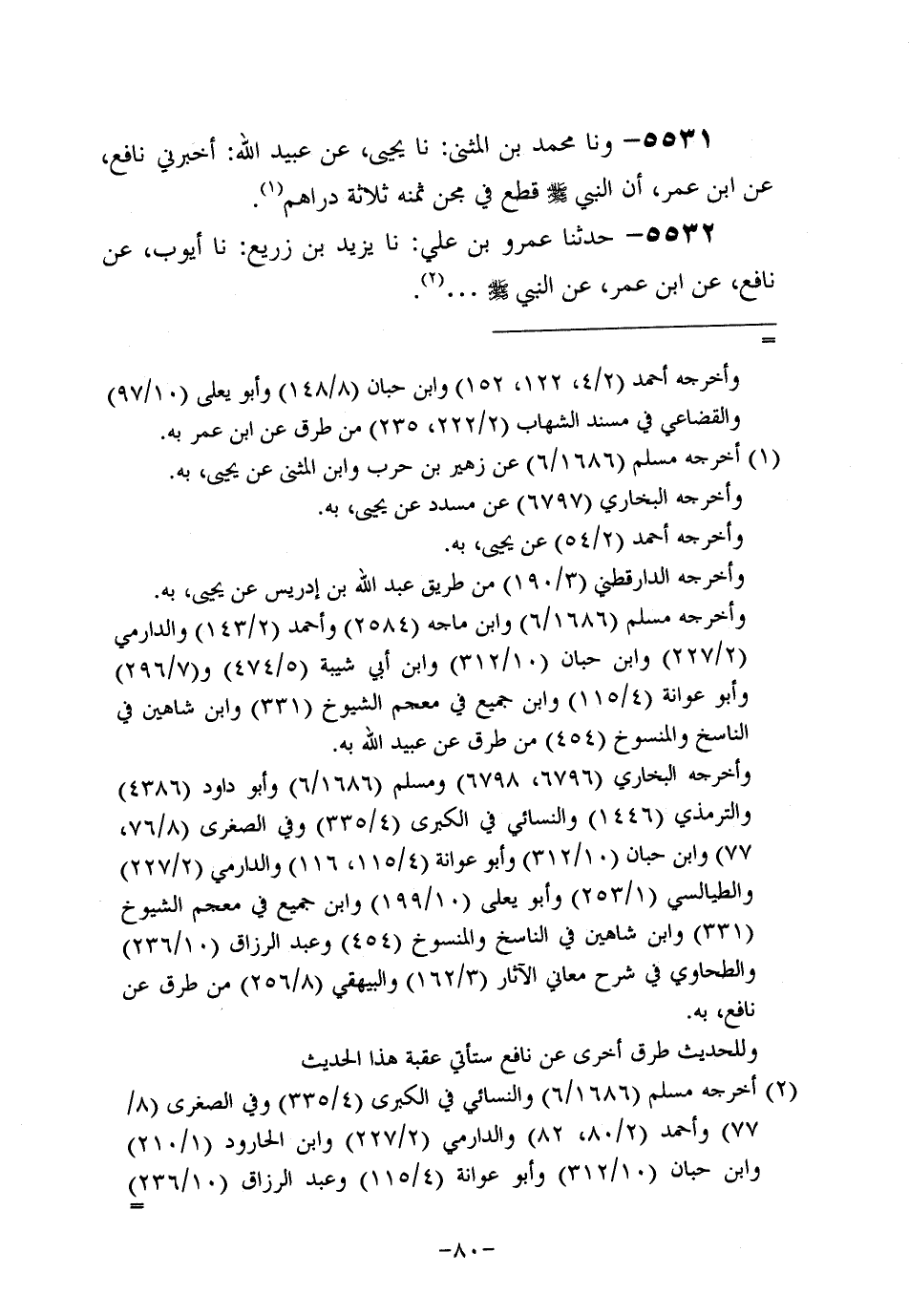 5531- وحَدَّثنا مُحَمَّدُ بْنَ الْمُثَنَّى، حَدَّثنا يَحْيَى، عَن عُبَيد اللَّهِ: أَخْبَرَنِي نَافِعٍ، عَن ابْنِ عُمَر؛ أَن النَّبِيّ صَلَّى اللَّهُ عَلَيه وَسَلَّم قَطَعَ فِي مِجَنٍّ ثَمَنُهُ ثَلاثَةُ دَرَاهِمَ.