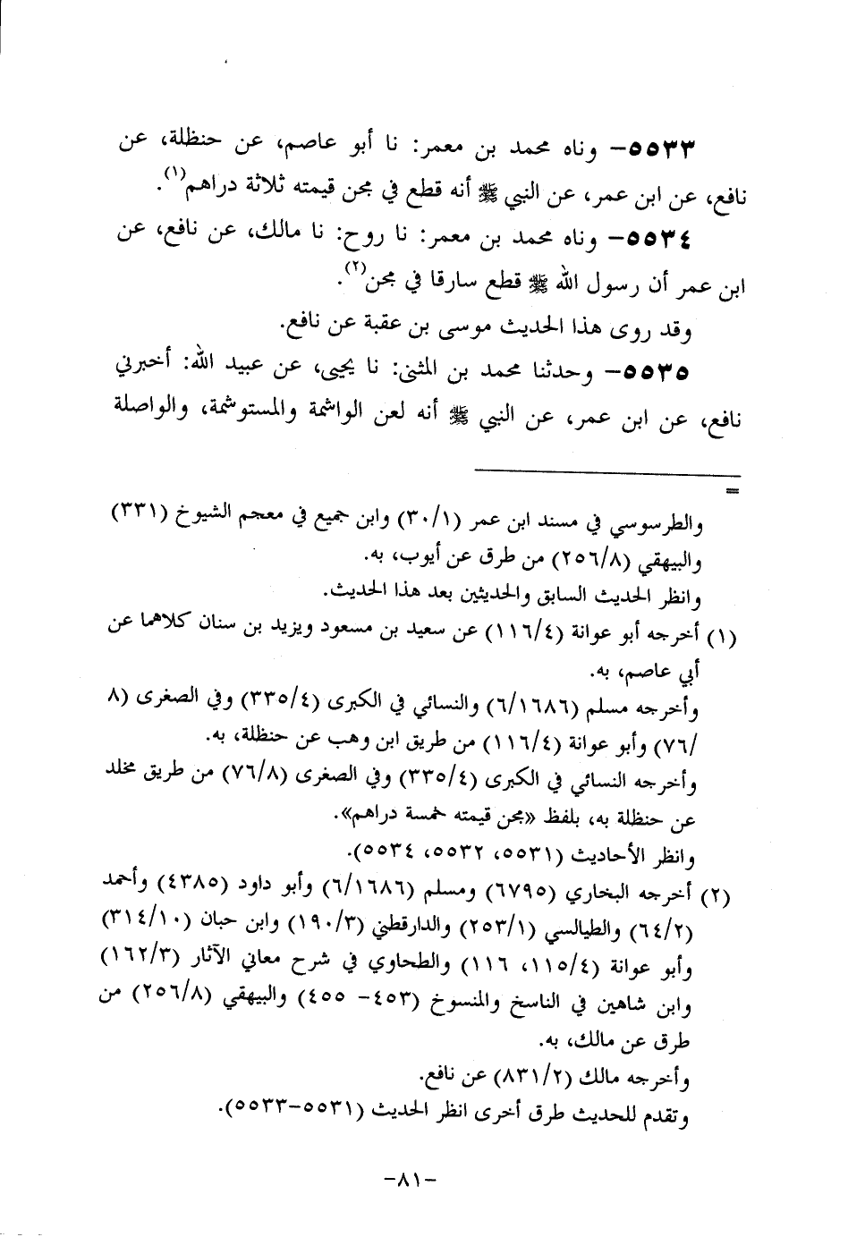 5533- وحَدَّثناه مُحَمد بن مَعْمَر، حَدَّثنا أَبُو عَاصِم، عَن حَنْظَلَةَ، عَن نافعٍ، عَن ابْنِ عُمَر، عَن النَّبِيّ صَلَّى اللَّهُ عَلَيه وَسَلَّم؛ أَنَّه قطع في مجن قيمته ثلاثية دراهم.