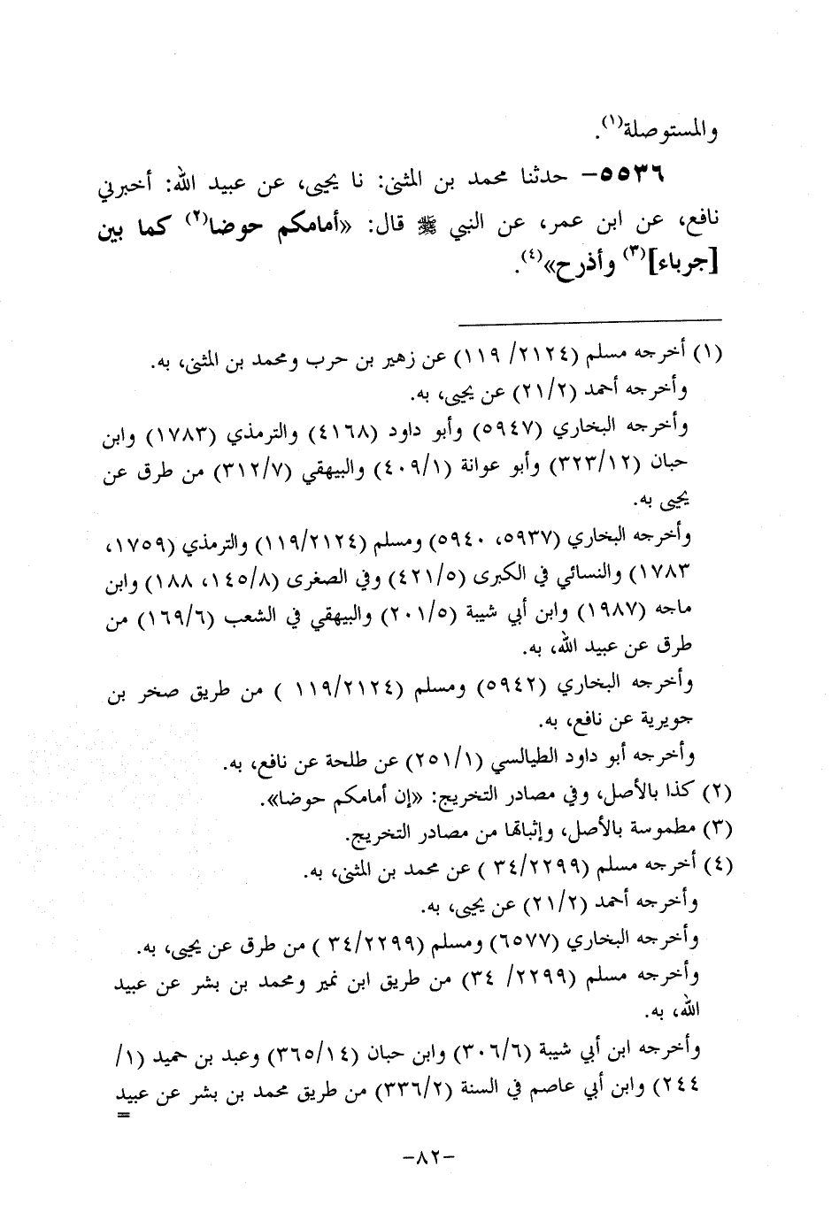 5536- حَدَّثنا مُحَمَّدُ بْنَ الْمُثَنَّى، حَدَّثنا يَحْيَى، عَن عُبَيد اللَّهِ، أَخْبَرَنِي نَافِعٍ، عَن ابْنِ عُمَر، عَن النَّبِيّ صَلَّى اللَّهُ عَلَيه وَسَلَّم قَالَ: أَمَامَكُمْ حَوْضٌ، كَمَا بَيْنَ جَرْبَاءَ وَأَذْرُحَ.