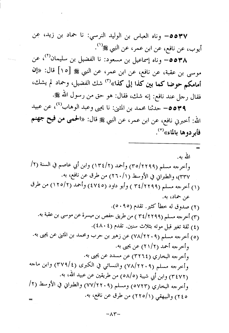 5537- وحَدَّثناه العباس بن الوليد النرسي، حَدَّثنا حَمَّادُ بُن زَيْدٍ، عَن أَيُّوبَ، عَن نافعٍ، عَن ابْنِ عُمَر، عَن النَّبِيّ صَلَّى اللَّهُ عَلَيه وَسَلَّم (ح)