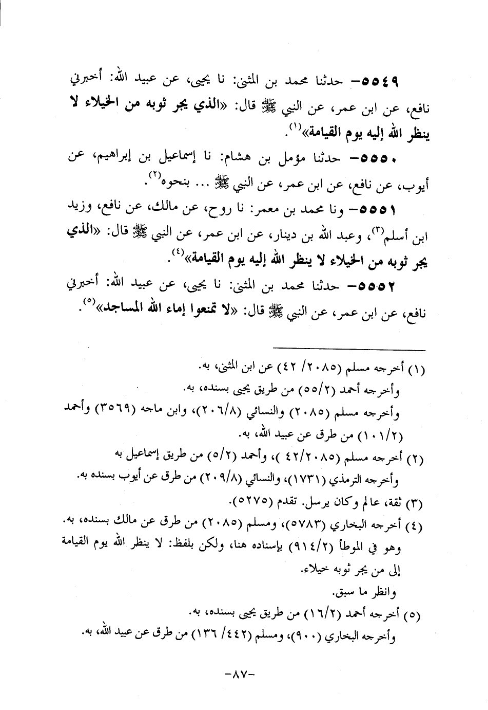 5549- حَدَّثنا مُحَمَّدُ بْنَ الْمُثَنَّى، حَدَّثنا يَحْيَى، عَن عُبَيد اللَّهِ: أَخْبَرَنِي نَافِعٍ، عَن ابْنِ عُمَر، عَن النَّبِيّ صَلَّى اللَّهُ عَلَيه وَسَلَّم قَالَ: الَّذِي يَجُرُّ ثَوْبَهُ مِنَ الْخُيَلاءِ لا يَنْظُرُ اللَّهُ إِلَيْهِ يَوْمَ الْقِيَامَةِ.