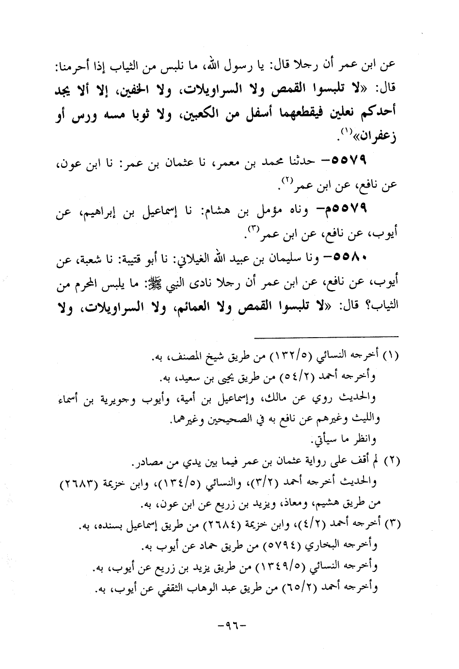 5580- وحَدَّثنا سليمان بن عُبَيد الله الغيلاني، حَدَّثنا أَبُو قُتَيبة، حَدَّثنا شُعْبَةُ، عَن أَيُّوبَ، عَن نافعٍ، عَن ابْنِ عُمَر؛ أَن رَجُلا نَادَى النَّبِيّ صَلَّى اللَّهُ عَلَيه وَسَلَّم: مَا يَلْبَسُ الْمُحْرِمُ مِنَ الثِّيَابِ؟ قَالَ: لا تَلْبَسُوا الْقُمُصَ، ولاَ الْعَمَائِمَ، ولاَ السَّرَاوِيلاتِ، ولاَ الْبَرَانِسَ، ولاَ الْخِفَافَ إلاَّ أَلا يَكُونَ نِعَالٌ فَخُفَّيْنِ دُونَ الْكَعْبَيْنِ، ولاَ ثَوْبًا مسه بِوَرْسٍ، أَوْ زَعَفْرَانٍ.