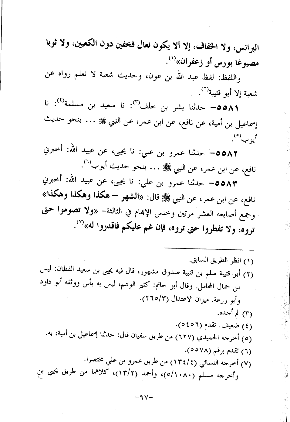 5583- حَدَّثَنا عَمْرُو بْنُ عَلِيٍّ، حَدَّثَنا يَحْيَى، عَن عُبَيد اللَّهِ: أَخْبَرَنِي نَافِعٍ، عَن ابْنِ عُمَر، عَن النَّبِيّ صَلَّى اللَّهُ عَلَيه وَسَلَّم قَالَ: الشَّهْرُ هَكَذَا وَهَكَذَا وَهَكَذَا وَجَمَعَ أَصَابِعَهُ الْعَشْرَ مَرَّتَيْنِ وَخَنَسَ الإِبْهَامَ فِي الثَّالِثة، ولاَ تَصُومُوا حَتَّى تَرَوْهُ، ولاَ تُفْطِرُوا حَتَّى تَرَوْهُ فَإِنْ غُمَّ عَلَيْكُمْ فَاقْدُرُوا لَهُ.