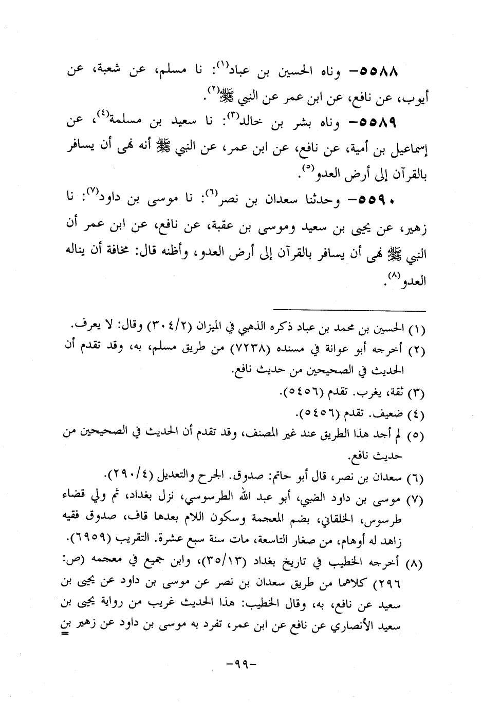 5590 - وحَدَّثنا سعدان بن نصر، حَدَّثنا موسى بن داود، حَدَّثنا زُهَيْرٌ، عَن يَحْيَى بْنِ سَعِيد وَمُوسَى بْنِ عُقْبَةَ، عَن نافعٍ، عَن ابْنِ عُمَر؛ أَن النَّبِيّ صَلَّى اللَّهُ عَلَيه وَسَلَّم نَهَى أَنْ يُسَافَرَ بِالْقُرْآنِ إِلَى أَرْضِ الْعَدُوِّ.