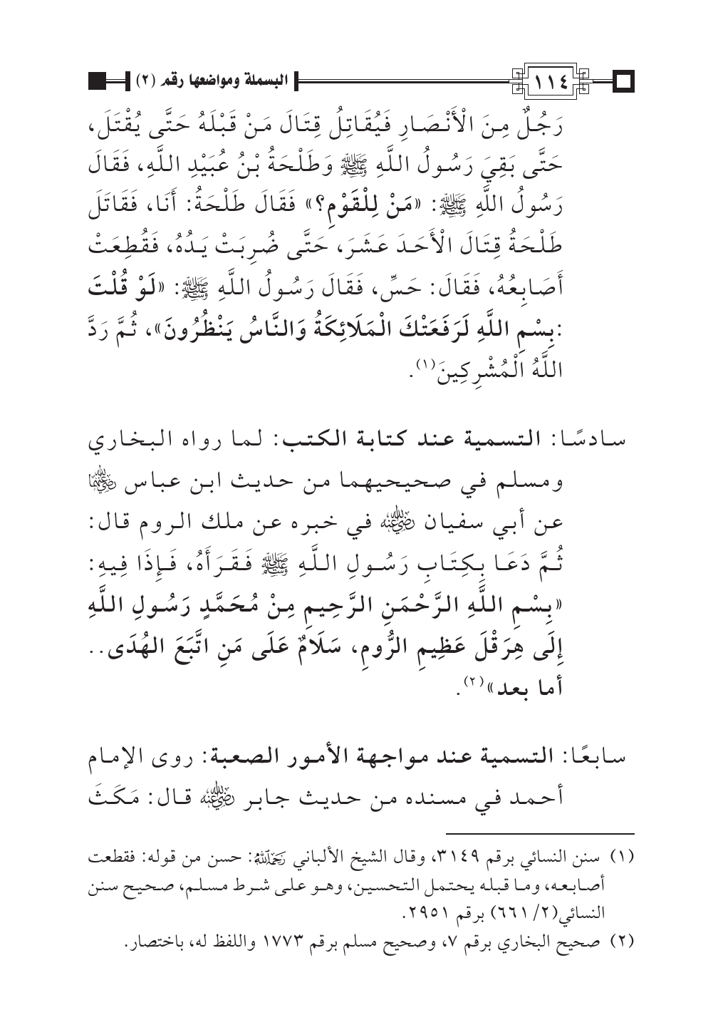 سادسًا: التسمية عند كتابة الكتب: لما رواه البخاري ومسلم في صحيحيهما من حديث ابن عباس - رضي الله عنهما - عن أبي سفيان - رضي الله عنه - في خبره عن ملك الروم قال: ثُمَّ دَعَا بِكِتَابِ رَسُولِ اللَّهِ - صلى الله عليه وسلم - فَقَرَأَهُ، فَإِذَا فِيهِ: «بِسْمِ اللَّهِ الرَّحْمَنِ الرَّحِيمِ مِنْ مُحَمَّدٍ رَسُولِ اللَّهِ إِلَى هِرَقْلَ عَظِيمِ الرُّومِ، سَلَامٌ عَلَى مَنِ اتَّبَعَ الهُدَى .. أما بعد» (¬٢).