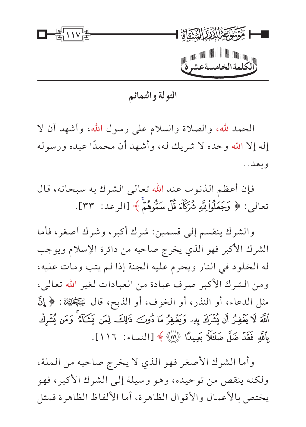 والشرك ينقسم إلى قسمين: شرك أكبر، وشرك أصغر، فأما الشرك الأكبر فهو الذي يخرج صاحبه من دائرة الإسلام ويوجب له الخلود في النار ويحرم عليه الجنة إذا لم يتب ومات عليه، ومن الشرك الأكبر صرف عبادة من العبادات لغير الله تعالى، مثل الدعاء، أو النذر، أو الخوف، أو الذبح، قال -سُبْحَانَهُ-: {إِنَّ اللَّهَ لَا يَغْفِرُ أَنْ يُشْرَكَ بِهِ وَيَغْفِرُ مَا دُونَ ذَلِكَ لِمَنْ يَشَاءُ وَمَنْ يُشْرِكْ بِاللَّهِ فَقَدْ ضَلَّ ضَلَالًا بَعِيدًا (١١٦)} [النساء: ١١٦].