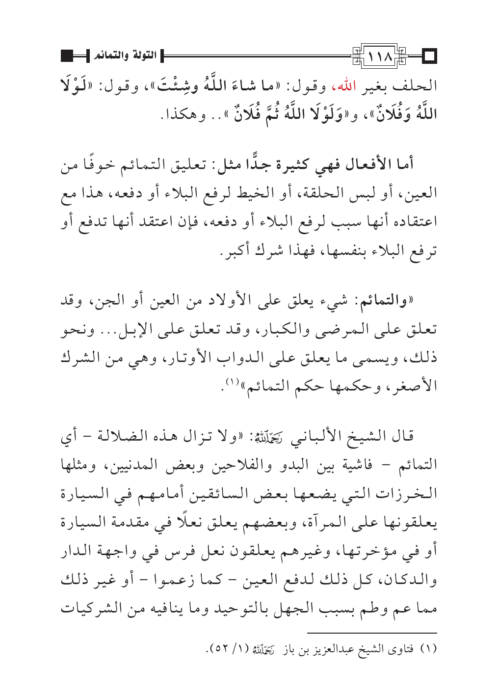 قال الشيخ الألباني - رحمه الله -: «ولا تزال هذه الضلالة - أي التمائم - فاشية بين البدو والفلاحين وبعض المدنيين، ومثلها الخرزات التي يضعها بعض السائقين أمامهم في السيارة يعلقونها على المرآة، وبعضهم يعلق نعلًا في مقدمة السيارة أو في مؤخرتها، وغيرهم يعلقون نعل فرس في واجهة الدار والدكان، كل ذلك لدفع العين - كما زعموا - أو غير ذلك مما عم وطم بسبب الجهل بالتوحيد وما ينافيه من الشركيات