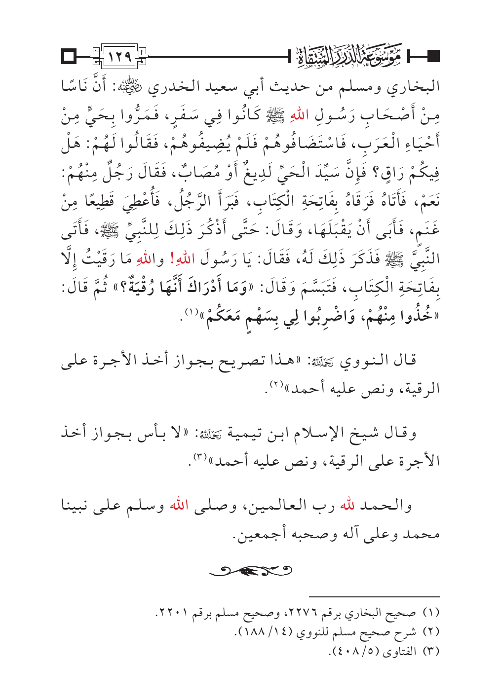 البخاري ومسلم من حديث أبي سعيد الخدري - رضي الله عنه -: أَنَّ نَاسًا مِنْ أَصْحَابِ رَسُولِ اللهِ - صلى الله عليه وسلم - كَانُوا فِي سَفَرٍ، فَمَرُّوا بِحَيٍّ مِنْ أَحْيَاءِ الْعَرَبِ، فَاسْتَضَافُوهُمْ فَلَمْ يُضِيفُوهُمْ، فَقَالُوا لَهُمْ: هَلْ فِيكُمْ رَاقٍ؟ فَإِنَّ سَيِّدَ الْحَيِّ لَدِيغٌ أَوْ مُصَابٌ، فَقَالَ رَجُلٌ مِنْهُمْ: نَعَمْ، فَأَتَاهُ فَرَقَاهُ بِفَاتِحَةِ الْكِتَابِ، فَبَرَأَ الرَّجُلُ، فَأُعْطِيَ قَطِيعًا مِنْ غَنَمٍ، فَأَبَى أَنْ يَقْبَلَهَا، وَقَالَ: حَتَّى أَذْكُرَ ذَلِكَ لِلنَّبِيِّ - صلى الله عليه وسلم -، فَأَتَى النَّبِيَّ - صلى الله عليه وسلم - فَذَكَرَ ذَلِكَ لَهُ، فَقَالَ: يَا رَسُولَ اللهِ! واللهِ مَا رَقَيْتُ إِلَّا بِفَاتِحَةِ الْكِتَابِ، فَتَبَسَّمَ وَقَالَ: «وَمَا أَدْرَاكَ أَنَّهَا رُقْيَةٌ؟» ثُمَّ قَالَ: «خُذُوا مِنْهُمْ، وَاضْرِبُوا لِي بِسَهْمٍ مَعَكُمْ» (¬١).