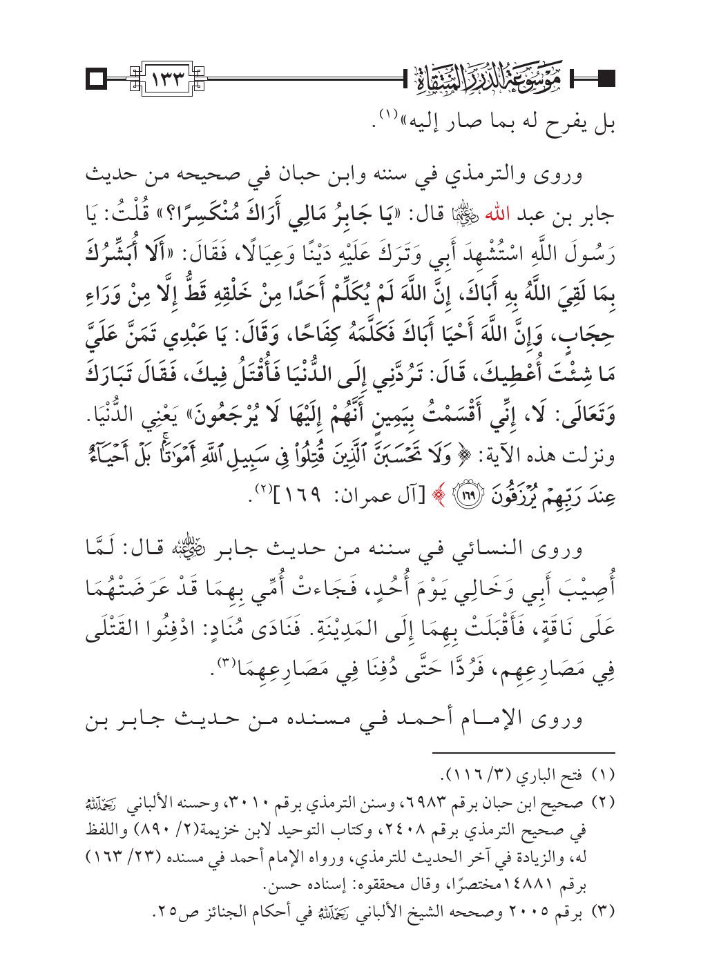 وروى والترمذي في سننه وابن حبان في صحيحه من حديث جابر بن عبد الله - عز وجل - قال: «يَا جَابِرُ مَالِي أَرَاكَ مُنْكَسِرًا؟» قُلْتُ: يَا رَسُولَ اللَّهِ اسْتُشْهِدَ أَبِي وَتَرَكَ عَلَيْهِ دَيْنًا وَعِيَالًا، فَقَالَ: «أَلَا أُبَشِّرُكَ بِمَا لَقِيَ اللَّهُ بِهِ أَبَاكَ، إِنَّ اللَّهَ لَمْ يُكَلِّمْ أَحَدًا مِنْ خَلْقِهِ قَطُّ إِلَّا مِنْ وَرَاءِ حِجَابٍ، وَإِنَّ اللَّهَ أَحْيَا أَبَاكَ فَكَلَّمَهُ كِفَاحًا، وَقَالَ: يَا عَبْدِي تَمَنَّ عَلَيَّ مَا شِئْتَ أُعْطِيكَ، قَالَ: تَرُدَّنِي إِلَى الدُّنْيَا فَأُقْتَلُ فِيكَ، فَقَالَ تَبَارَكَ وَتَعَالَى: لَا، إِنِّي أَقْسَمْتُ بِيَمِينٍ أَنَّهُمْ إِلَيْهَا لَا يُرْجَعُونَ» يَعْنِي الدُّنْيَا. ونزلت هذه الآية: {وَلَا تَحْسَبَنَّ الَّذِينَ قُتِلُوا فِي سَبِيلِ اللَّهِ أَمْوَاتًا بَلْ أَحْيَاءٌ عِنْدَ رَبِّهِمْ يُرْزَقُونَ (١٦٩)} [آل عمران: ١٦٩] (¬٢).