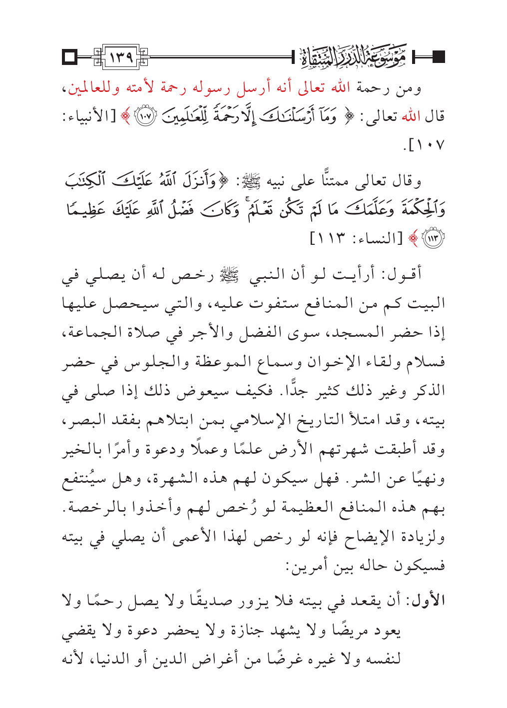 أقول: أرأيت لو أن النبي - صلى الله عليه وسلم - رخص له أن يصلي في البيت كم من المنافع ستفوت عليه، والتي سيحصل عليها إذا حضر المسجد، سوى الفضل والأجر في صلاة الجماعة، فسلام ولقاء الإخوان وسماع الموعظة والجلوس في حضر الذكر وغير ذلك كثير جدًّا. فكيف سيعوض ذلك إذا صلى في بيته، وقد امتلأ التاريخ الإسلامي بمن ابتلاهم بفقد البصر، وقد أطبقت شهرتهم الأرض علمًا وعملًا ودعوة وأمرًا بالخير ونهيًا عن الشر. فهل سيكون لهم هذه الشهرة، وهل سيُنتفع بهم هذه المنافع العظيمة لو رُخص لهم وأخذوا بالرخصة. ولزيادة الإيضاح فإنه لو رخص لهذا الأعمى أن يصلي في بيته فسيكون حاله بين أمرين: