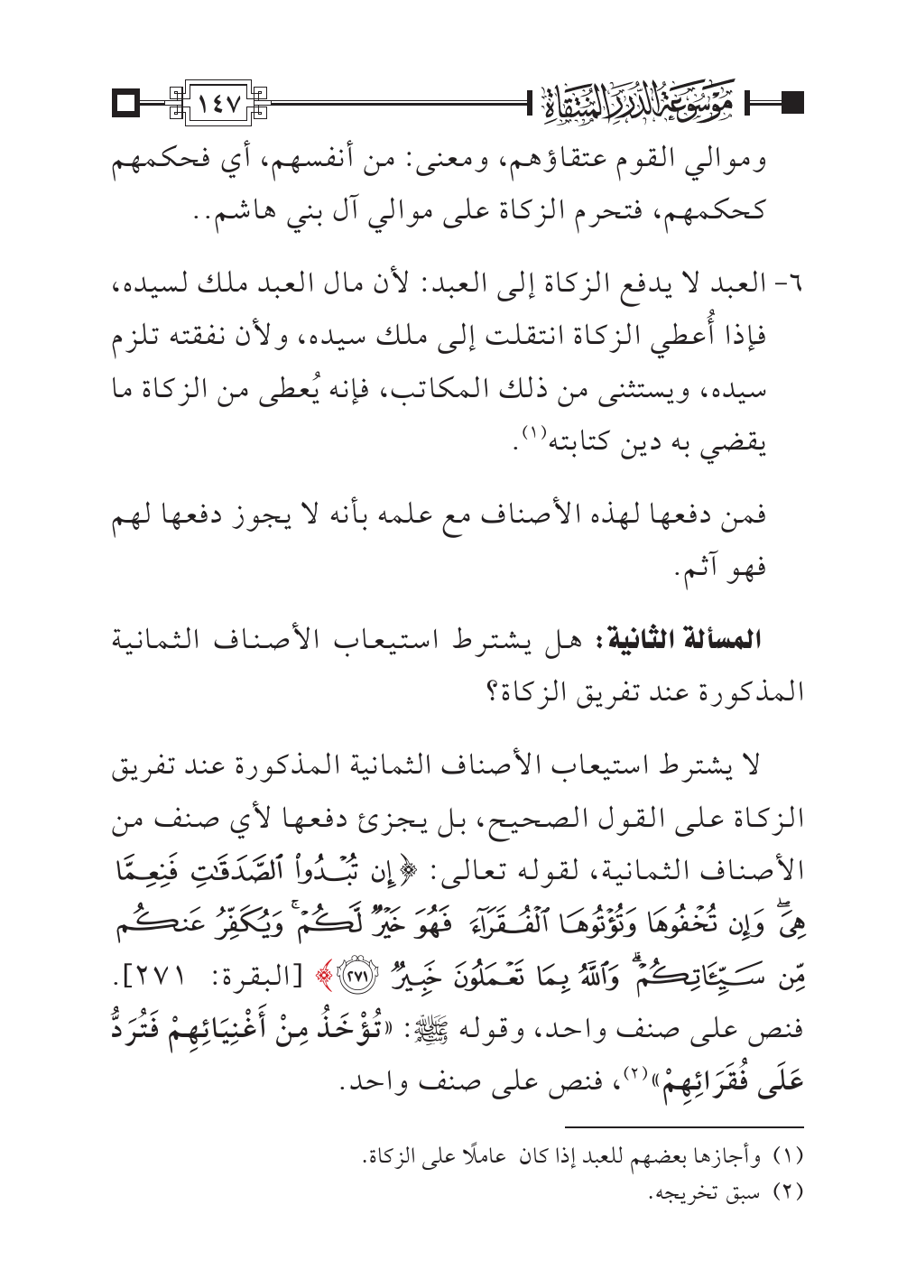 ٦ - العبد لا يدفع الزكاة إلى العبد: لأن مال العبد ملك لسيده، فإذا أُعطي الزكاة انتقلت إلى ملك سيده، ولأن نفقته تلزم سيده، ويستثنى من ذلك المكاتب، فإنه يُعطى من الزكاة ما يقضي به دين كتابته (¬١).