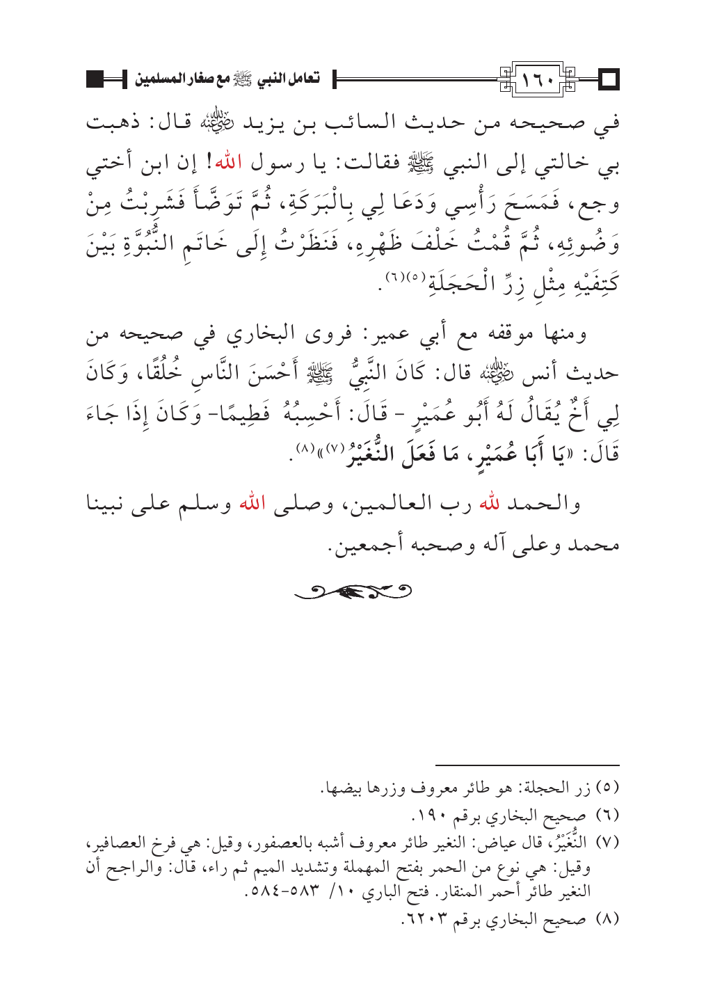 (¬٣). النُّغَيْرُ، قال عياض: النغير طائر معروف أشبه بالعصفور، وقيل: هي فرخ العصافير، وقيل: هي نوع من الحمر بفتح المهملة وتشديد الميم ثم راء، قال: والراجح أن النغير طائر أحمر المنقار. فتح الباري ١٠/ ٥٨٣ - ٥٨٤.