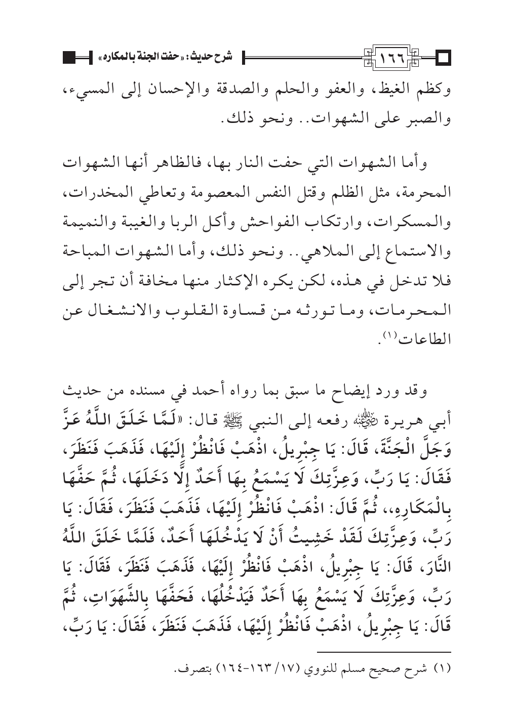 وقد ورد إيضاح ما سبق بما رواه أحمد في مسنده من حديث أبي هريرة - رضي الله عنه - رفعه إلى النبي - صلى الله عليه وسلم - قال: «لَمَّا خَلَقَ اللَّهُ عَزَّ وَجَلَّ الْجَنَّةَ، قَالَ: يَا جِبْرِيلُ، اذْهَبْ فَانْظُرْ إِلَيْهَا، فَذَهَبَ فَنَظَرَ، فَقَالَ: يَا رَبِّ، وَعِزَّتِكَ لَا يَسْمَعُ بِهَا أَحَدٌ إِلَّا دَخَلَهَا، ثُمَّ حَفَّهَا بِالْمَكَارِهِ،، ثُمَّ قَالَ: اذْهَبْ فَانْظُرْ إِلَيْهَا، فَذَهَبَ فَنَظَرَ، فَقَالَ: يَا رَبِّ، وَعِزَّتِكَ لَقَدْ خَشِيتُ أَنْ لَا يَدْخُلَهَا أَحَدٌ، فَلَمَّا خَلَقَ اللَّهُ النَّارَ، قَالَ: يَا جِبْرِيلُ، اذْهَبْ فَانْظُرْ إِلَيْهَا، فَذَهَبَ فَنَظَرَ، فَقَالَ: يَا رَبِّ، وَعِزَّتِكَ لَا يَسْمَعُ بِهَا أَحَدٌ فَيَدْخُلُهَا، فَحَفَّهَا بِالشَّهَوَاتِ، ثُمَّ قَالَ: يَا جِبْرِيلُ، اذْهَبْ فَانْظُرْ إِلَيْهَا، فَذَهَبَ فَنَظَرَ، فَقَالَ: يَا رَبِّ،