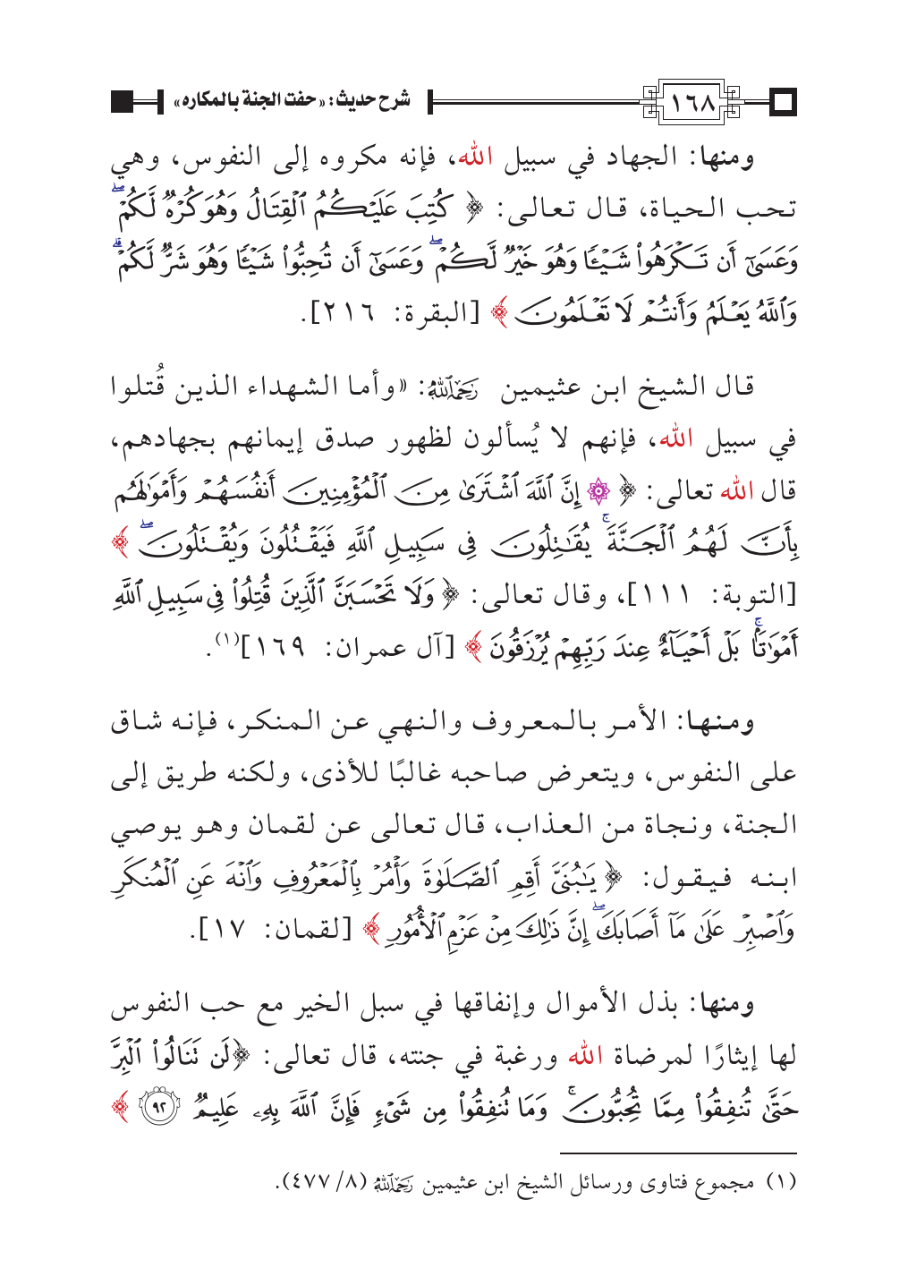 ومنها: الجهاد في سبيل الله، فإنه مكروه إلى النفوس، وهي تحب الحياة، قال تعالى: {كُتِبَ عَلَيْكُمُ الْقِتَالُ وَهُوَ كُرْهٌ لَكُمْ وَعَسَى أَنْ تَكْرَهُوا شَيْئًا وَهُوَ خَيْرٌ لَكُمْ وَعَسَى أَنْ تُحِبُّوا شَيْئًا وَهُوَ شَرٌّ لَكُمْ وَاللَّهُ يَعْلَمُ وَأَنْتُمْ لَا تَعْلَمُونَ} [البقرة: ٢١٦].