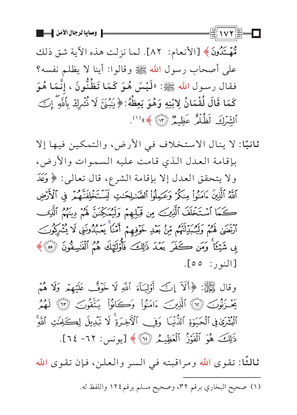 مُهْتَدُونَ} [الأنعام: ٨٢]. لما نزلت هذه الآية شق ذلك على أصحاب رسول الله - صلى الله عليه وسلم - وقالوا: أينا لا يظلم نفسه؟ فقال رسول الله - صلى الله عليه وسلم -: «لَيْسَ هُوَ كَمَا تَظُنُّونَ، إِنَّمَا هُوَ كَمَا قَالَ لُقْمَانُ لِابْنِهِ وَهُوَ يَعِظُهُ: {يَابُنَيَّ لَا تُشْرِكْ بِاللَّهِ إِنَّ الشِّرْكَ لَظُلْمٌ عَظِيمٌ (١٣)}» (¬١).