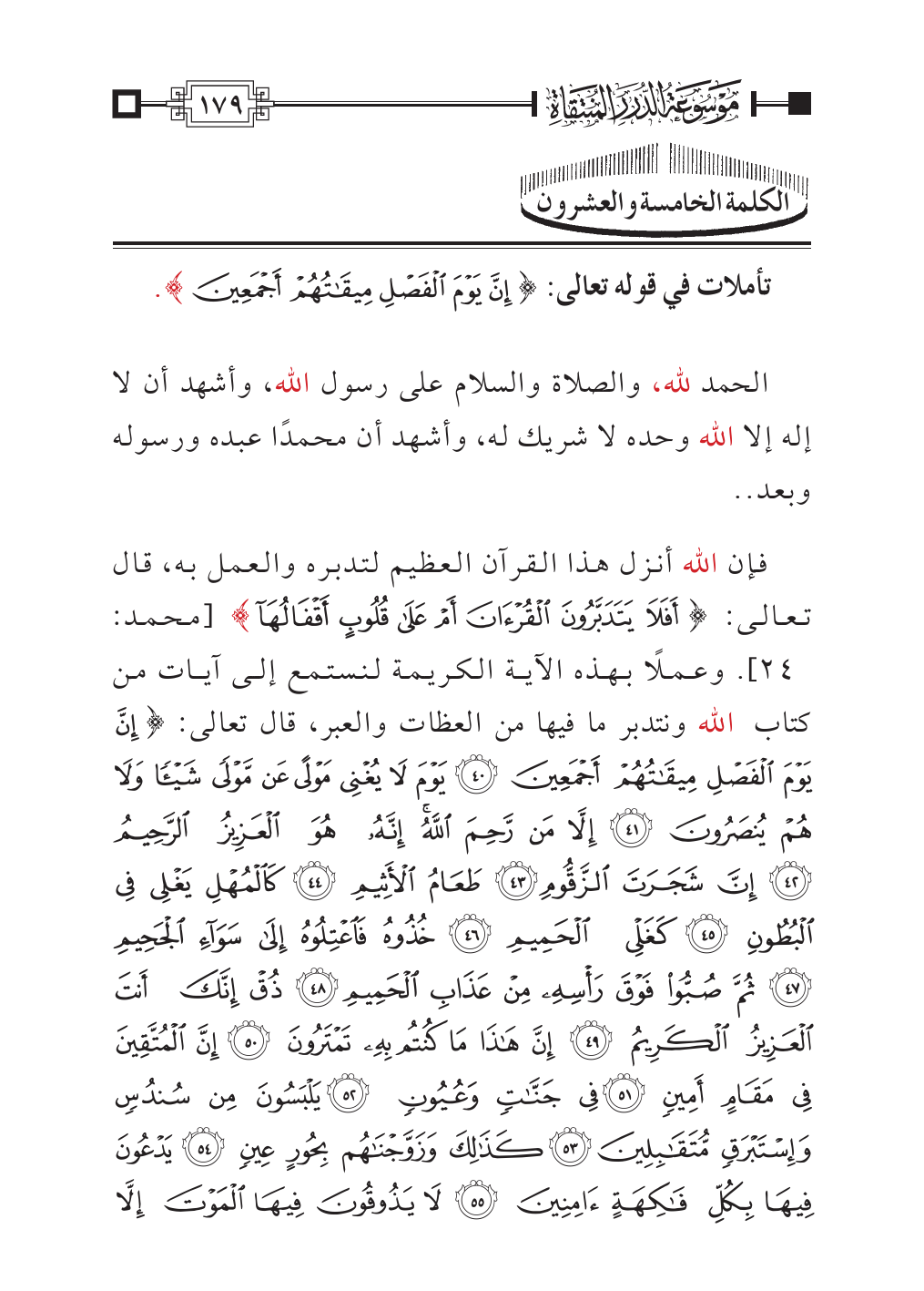 تأملات في قوله تعالى: {إِنَّ يَوْمَ الْفَصْلِ مِيقَاتُهُمْ أَجْمَعِينَ}.