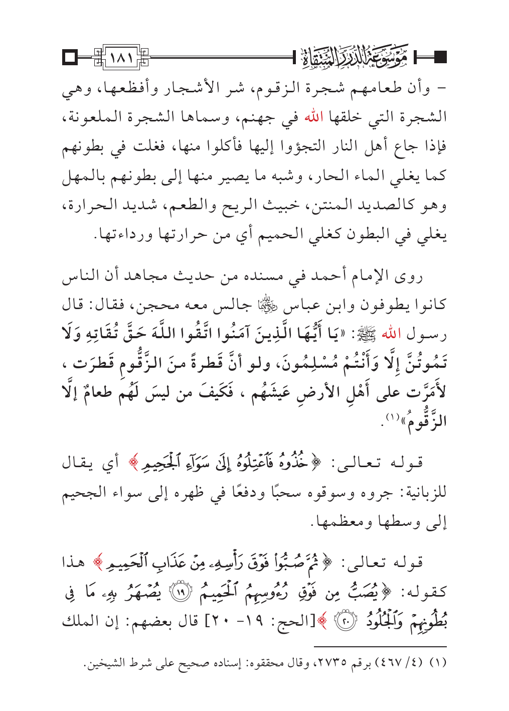 روى الإمام أحمد في مسنده من حديث مجاهد أن الناس كانوا يطوفون وابن عباس - رضي الله عنهما - جالس معه محجن، فقال: قال رسول الله - صلى الله عليه وسلم -: «يَا أَيُّهَا الَّذِينَ آمَنُوا اتَّقُوا اللَّهَ حَقَّ تُقَاتِهِ وَلَا تَمُوتُنَّ إِلَّا وَأَنْتُمْ مُسْلِمُونَ، ولو أنَّ قَطرةً منَ الزَّقُّومِ قَطرَت، لأَمَرَّت على أَهْلِ الأرضِ عَيشَهُم، فَكَيفَ من ليسَ لَهُم طعامٌ إلَّا الزَّقُّومُ» (¬١).