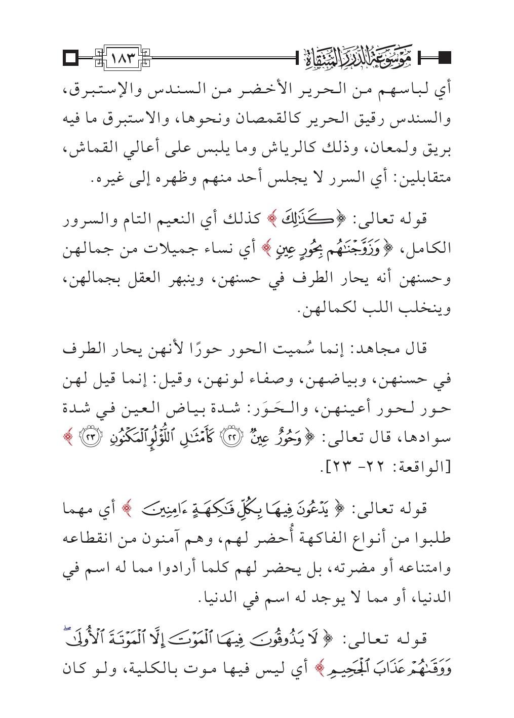 قال مجاهد: إنما سُميت الحور حورًا لأنهن يحار الطرف في حسنهن، وبياضهن، وصفاء لونهن، وقيل: إنما قيل لهن حور لحور أعينهن، والحَوَر: شدة بياض العين في شدة سوادها، قال تعالى: {وَحُورٌ عِينٌ (٢٢) كَأَمْثَالِ اللُّؤْلُؤِ الْمَكْنُونِ (٢٣)} [الواقعة: ٢٢ - ٢٣].