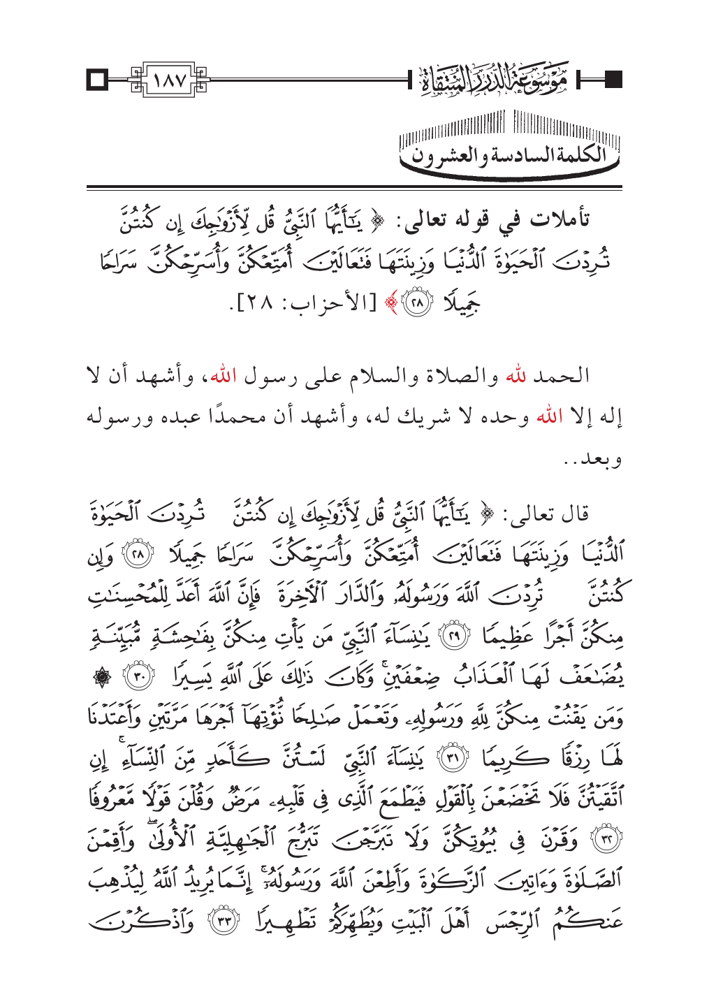 قال تعالى: {يَاأَيُّهَا النَّبِيُّ قُلْ لِأَزْوَاجِكَ إِنْ كُنْتُنَّ تُرِدْنَ الْحَيَاةَ الدُّنْيَا وَزِينَتَهَا فَتَعَالَيْنَ أُمَتِّعْكُنَّ وَأُسَرِّحْكُنَّ سَرَاحًا جَمِيلًا (٢٨) وَإِنْ كُنْتُنَّ تُرِدْنَ اللَّهَ وَرَسُولَهُ وَالدَّارَ الْآخِرَةَ فَإِنَّ اللَّهَ أَعَدَّ لِلْمُحْسِنَاتِ مِنْكُنَّ أَجْرًا عَظِيمًا (٢٩) يَانِسَاءَ النَّبِيِّ مَنْ يَأْتِ مِنْكُنَّ بِفَاحِشَةٍ مُبَيِّنَةٍ يُضَاعَفْ لَهَا الْعَذَابُ ضِعْفَيْنِ وَكَانَ ذَلِكَ عَلَى اللَّهِ يَسِيرًا (٣٠) وَمَنْ يَقْنُتْ مِنْكُنَّ لِلَّهِ وَرَسُولِهِ وَتَعْمَلْ صَالِحًا نُؤْتِهَا أَجْرَهَا مَرَّتَيْنِ وَأَعْتَدْنَا لَهَا رِزْقًا كَرِيمًا (٣١) يَانِسَاءَ النَّبِيِّ لَسْتُنَّ كَأَحَدٍ مِنَ النِّسَاءِ إِنِ اتَّقَيْتُنَّ فَلَا تَخْضَعْنَ بِالْقَوْلِ فَيَطْمَعَ الَّذِي فِي قَلْبِهِ مَرَضٌ وَقُلْنَ قَوْلًا مَعْرُوفًا (٣٢) وَقَرْنَ فِي بُيُوتِكُنَّ وَلَا تَبَرَّجْنَ تَبَرُّجَ الْجَاهِلِيَّةِ الْأُولَى وَأَقِمْنَ الصَّلَاةَ وَآتِينَ الزَّكَاةَ وَأَطِعْنَ اللَّهَ وَرَسُولَهُ إِنَّمَا يُرِيدُ اللَّهُ لِيُذْهِبَ عَنْكُمُ الرِّجْسَ أَهْلَ الْبَيْتِ وَيُطَهِّرَكُمْ تَطْهِيرًا (٣٣) وَاذْكُرْنَ