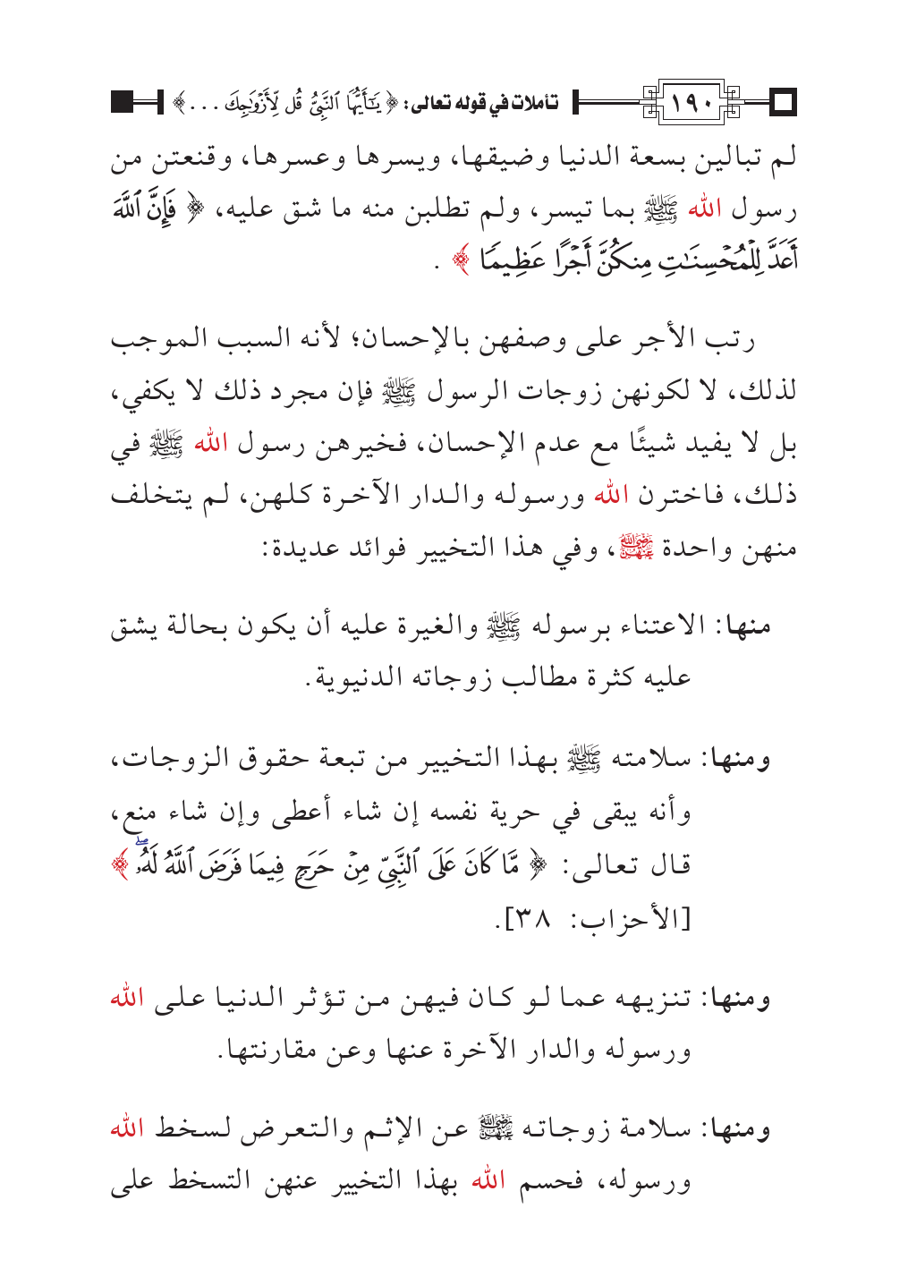 ومنها: سلامة زوجاته - رضي الله عنه -ن - عن الإثم والتعرض لسخط الله ورسوله، فحسم الله بهذا التخيير عنهن التسخط على