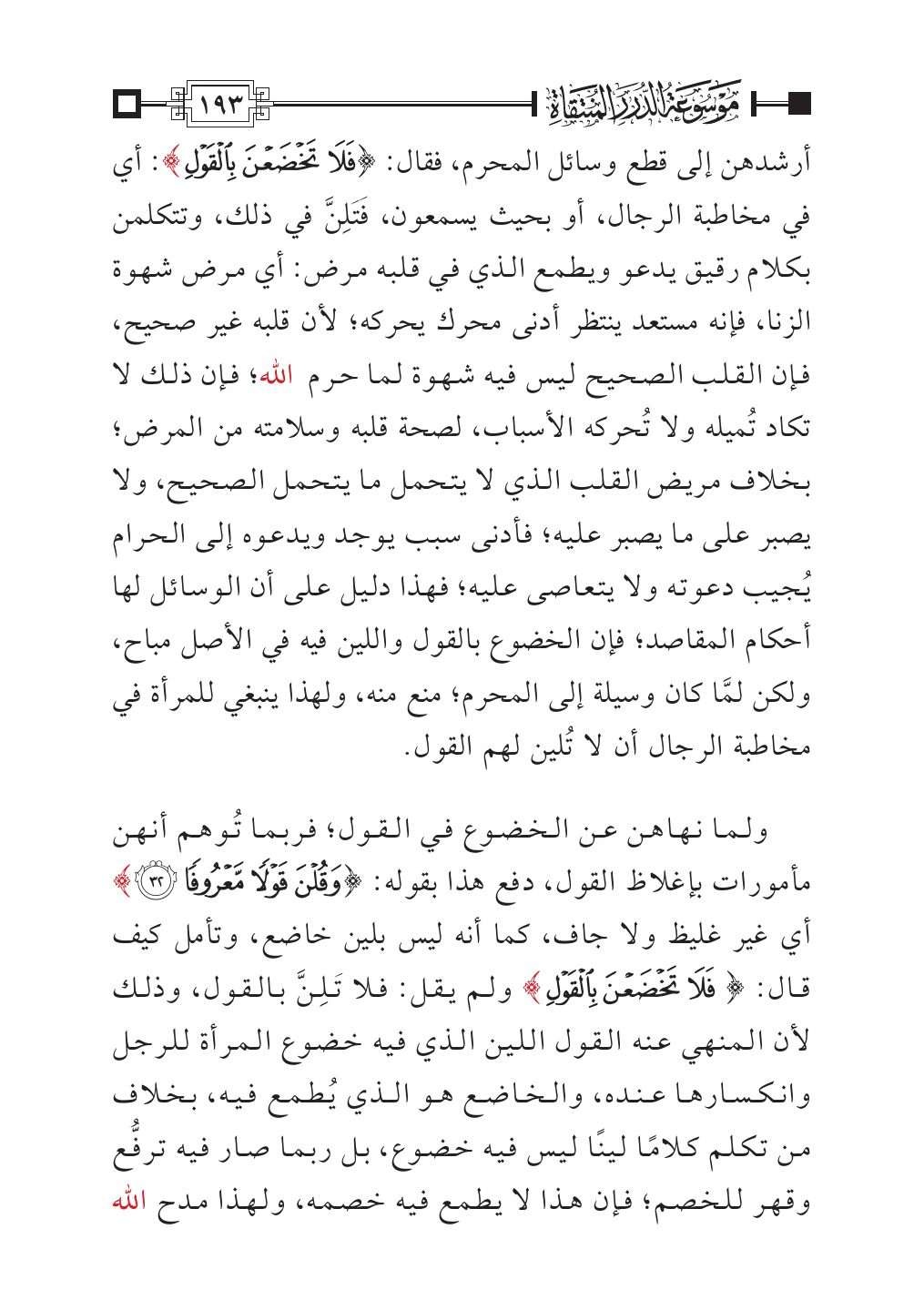 أرشدهن إلى قطع وسائل المحرم، فقال: {فَلَا تَخْضَعْنَ بِالْقَوْلِ}: أي في مخاطبة الرجال، أو بحيث يسمعون، فَتَلِنَّ في ذلك، وتتكلمن بكلام رقيق يدعو ويطمع الذي في قلبه مرض: أي مرض شهوة الزنا، فإنه مستعد ينتظر أدنى محرك يحركه؛ لأن قلبه غير صحيح، فإن القلب الصحيح ليس فيه شهوة لما حرم الله؛ فإن ذلك لا تكاد تُميله ولا تُحركه الأسباب، لصحة قلبه وسلامته من المرض؛ بخلاف مريض القلب الذي لا يتحمل ما يتحمل الصحيح، ولا يصبر على ما يصبر عليه؛ فأدنى سبب يوجد ويدعوه إلى الحرام يُجيب دعوته ولا يتعاصى عليه؛ فهذا دليل على أن الوسائل لها أحكام المقاصد؛ فإن الخضوع بالقول واللين فيه في الأصل مباح، ولكن لمَّا كان وسيلة إلى المحرم؛ منع منه، ولهذا ينبغي للمرأة في مخاطبة الرجال أن لا تُلين لهم القول.