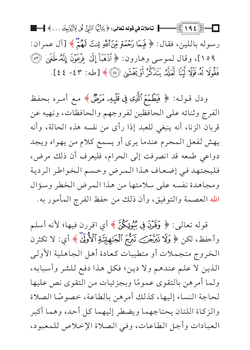 قوله تعالى: {وَقَرْنَ فِي بُيُوتِكُنَّ} أي اقررن فيها؛ لأنه أسلم وأحفظ، لكن {وَلَا تَبَرَّجْنَ تَبَرُّجَ الْجَاهِلِيَّةِ الْأُولَى} أي: لا تكثرن الخروج متجملات أو متطيبات كعادة أهل الجاهلية الأولى الذين لا علم عندهم ولا دين؛ فكل هذا دفع للشر وأسبابه، ولما أمرهن بالتقوى عمومًا وبجزئيات من التقوى نص عليها لحاجة النساء إليها، كذلك أمرهن بالطاعة، خصوصًا الصلاة والزكاة اللتان يحتاجهما ويضطر إليهما كل أحد، وهما أكبر العبادات وأجل الطاعات، وفي الصلاة الإخلاص للمعبود،