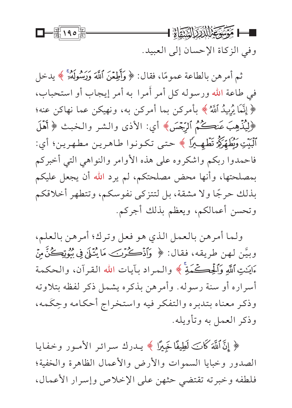 ثم أمرهن بالطاعة عمومًا، فقال: {وَأَطِعْنَ اللَّهَ وَرَسُولَهُ} يدخل في طاعة الله ورسوله كل أمر أَمرا به أمر إيجاب أو استحباب، {إِنَّمَا يُرِيدُ اللَّهُ} بأمركن بما أمركن به، ونهيكن عما نهاكن عنه؛ {لِيُذْهِبَ عَنْكُمُ الرِّجْسَ} أي: الأذى والشر والخبث {أَهْلَ الْبَيْتِ وَيُطَهِّرَكُمْ تَطْهِيرًا} حتى تكونوا طاهرين مطهرين؛ أي: فاحمدوا ربكم واشكروه على هذه الأوامر والنواهي التي أخبركم بمصلحتها، وأنها محض مصلحتكم، لم يرد الله أن يجعل عليكم بذلك حرجًا ولا مشقة، بل لتتزكى نفوسكم، وتتطهر أخلاقكم وتحسن أعمالكم، ويعظم بذلك أجركم.