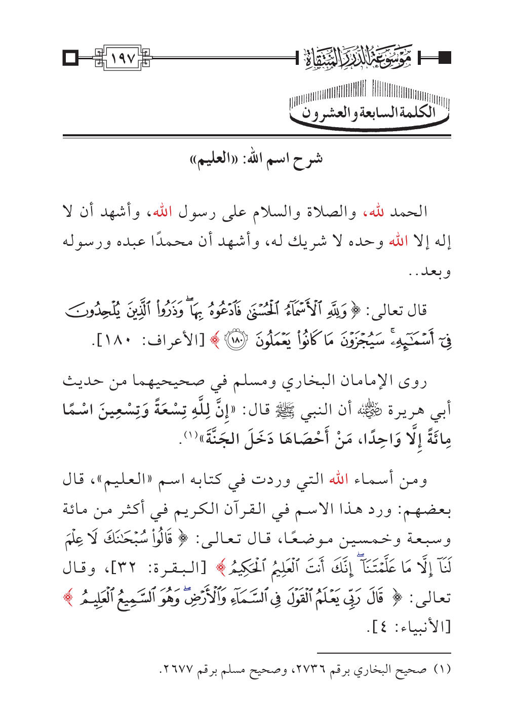 روى الإمامان البخاري ومسلم في صحيحيهما من حديث أبي هريرة - رضي الله عنه - أن النبي - صلى الله عليه وسلم - قال: «إِنَّ لِلَّهِ تِسْعَةً وَتِسْعِينَ اسْمًا مِائَةً إِلَّا وَاحِدًا، مَنْ أَحْصَاهَا دَخَلَ الجَنَّةَ» (¬١).