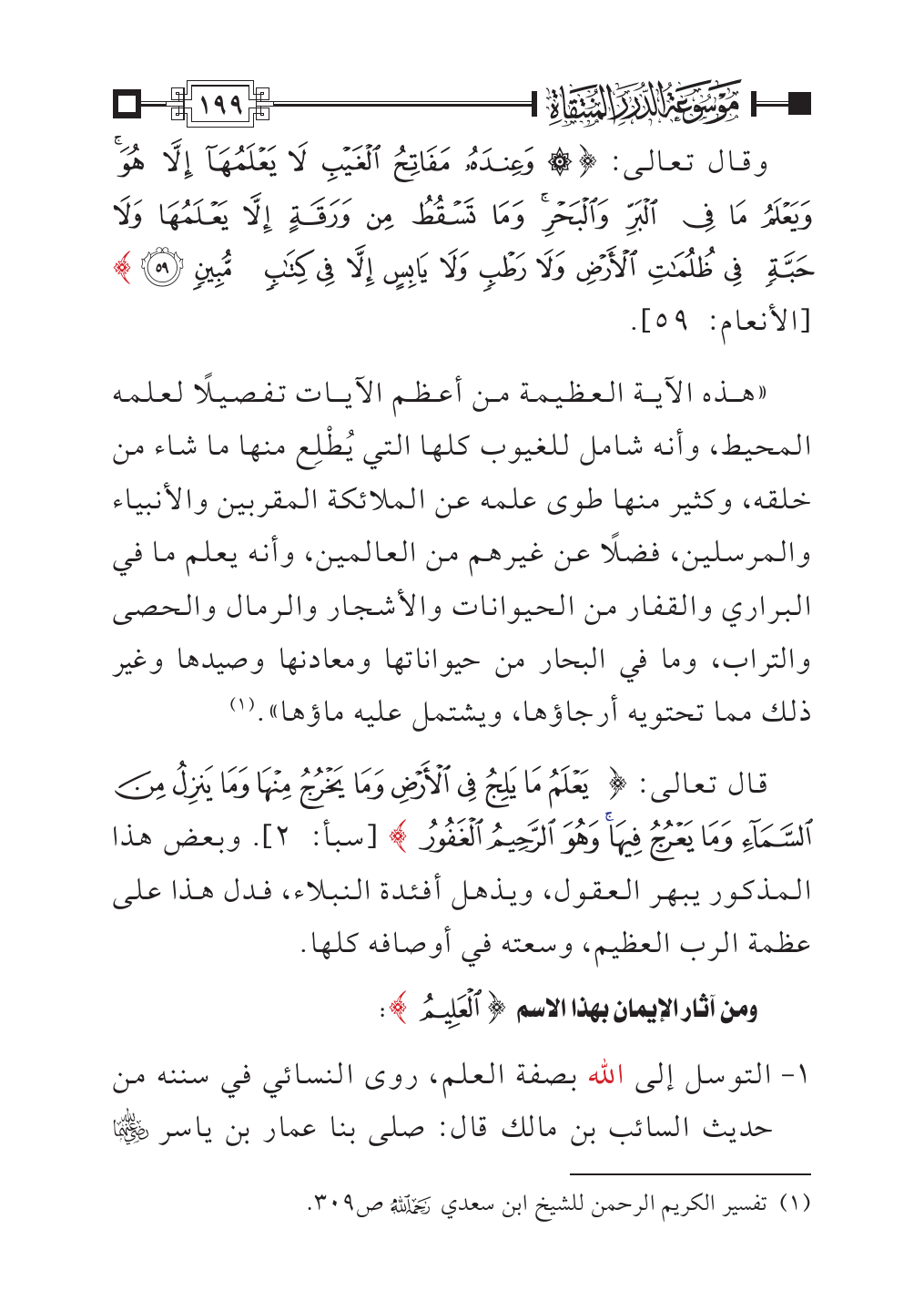 «هذه الآية العظيمة من أعظم الآيات تفصيلًا لعلمه المحيط، وأنه شامل للغيوب كلها التي يُطْلِع منها ما شاء من خلقه، وكثير منها طوى علمه عن الملائكة المقربين والأنبياء والمرسلين، فضلًا عن غيرهم من العالمين، وأنه يعلم ما في البراري والقفار من الحيوانات والأشجار والرمال والحصى والتراب، وما في البحار من حيواناتها ومعادنها وصيدها وغير ذلك مما تحتويه أرجاؤها، ويشتمل عليه ماؤها». (¬١)