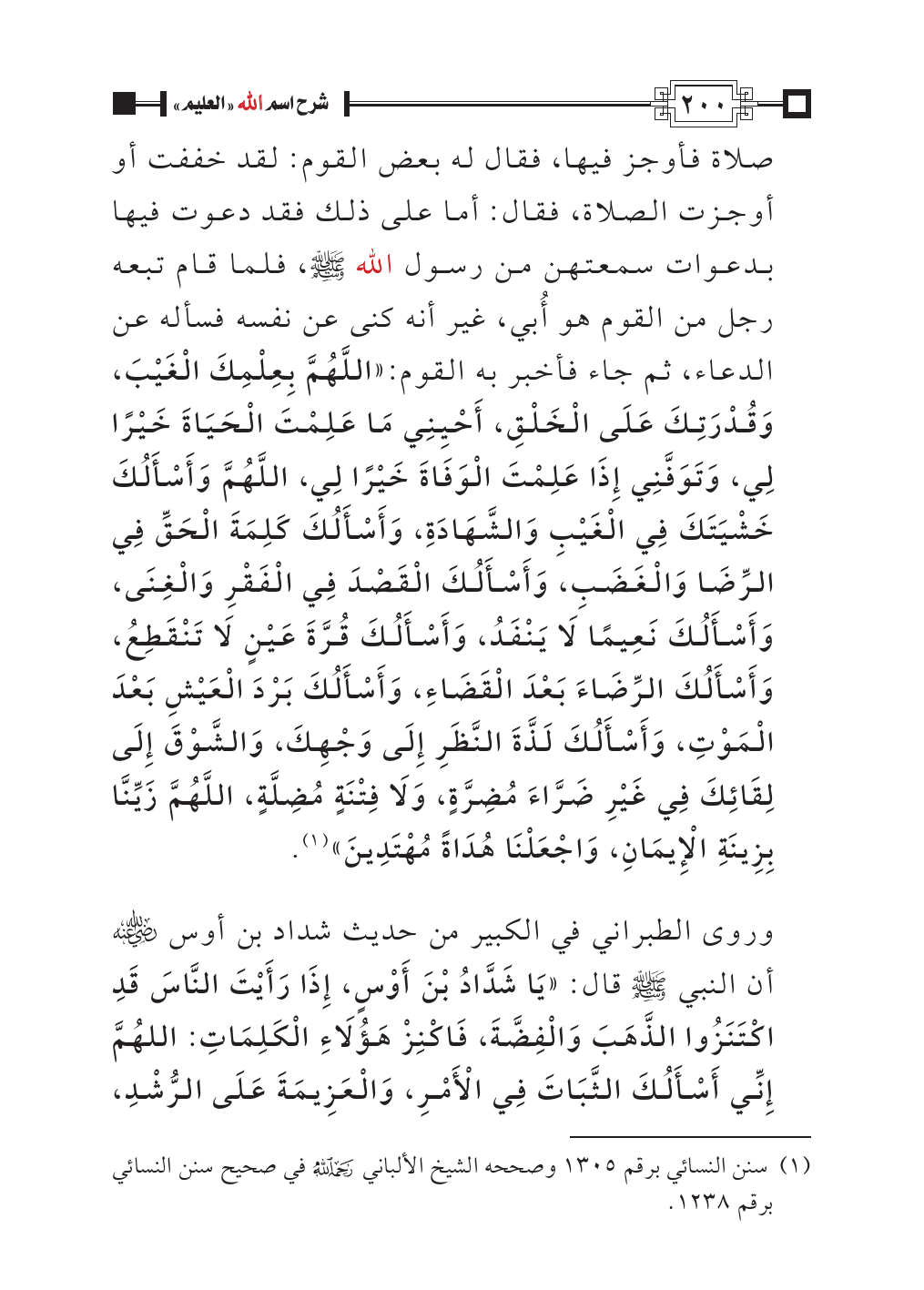 صلاة فأوجز فيها، فقال له بعض القوم: لقد خففت أو أوجزت الصلاة، فقال: أما على ذلك فقد دعوت فيها بدعوات سمعتهن من رسول الله - صلى الله عليه وسلم -، فلما قام تبعه رجل من القوم هو أُبي، غير أنه كنى عن نفسه فسأله عن الدعاء، ثم جاء فأخبر به القوم: «اللَّهُمَّ بِعِلْمِكَ الْغَيْبَ، وَقُدْرَتِكَ عَلَى الْخَلْقِ، أَحْيِنِي مَا عَلِمْتَ الْحَيَاةَ خَيْرًا لِي، وَتَوَفَّنِي إِذَا عَلِمْتَ الْوَفَاةَ خَيْرًا لِي، اللَّهُمَّ وَأَسْأَلُكَ خَشْيَتَكَ فِي الْغَيْبِ وَالشَّهَادَةِ، وَأَسْأَلُكَ كَلِمَةَ الْحَقِّ فِي الرِّضَا وَالْغَضَبِ، وَأَسْأَلُكَ الْقَصْدَ فِي الْفَقْرِ وَالْغِنَى، وَأَسْأَلُكَ نَعِيمًا لَا يَنْفَدُ، وَأَسْأَلُكَ قُرَّةَ عَيْنٍ لَا تَنْقَطِعُ، وَأَسْأَلُكَ الرِّضَاءَ بَعْدَ الْقَضَاءِ، وَأَسْأَلُكَ بَرْدَ الْعَيْشِ بَعْدَ الْمَوْتِ، وَأَسْأَلُكَ لَذَّةَ النَّظَرِ إِلَى وَجْهِكَ، وَالشَّوْقَ إِلَى لِقَائِكَ فِي غَيْرِ ضَرَّاءَ مُضِرَّةٍ، وَلَا فِتْنَةٍ مُضِلَّةٍ، اللَّهُمَّ زَيِّنَّا بِزِينَةِ الْإِيمَانِ، وَاجْعَلْنَا هُدَاةً مُهْتَدِينَ» (¬١).
