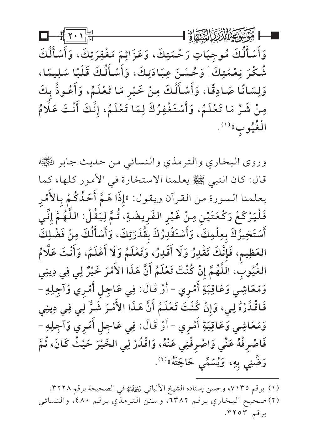 وروى البخاري والترمذي والنسائي من حديث جابر - رضي الله عنه - قال: كان النبي - صلى الله عليه وسلم - يعلمنا الاستخارة في الأمور كلها، كما يعلمنا السورة من القرآن ويقول: «إِذَا هَمَّ أَحَدُكُمْ بِالأَمْرِ فَلْيَرْكَعْ رَكْعَتَيْنِ مِنْ غَيْرِ الفَرِيضَةِ، ثُمَّ لِيَقُلْ: اللَّهُمَّ إِنِّي أَسْتَخِيرُكَ بِعِلْمِكَ، وَأَسْتَقْدِرُكَ بِقُدْرَتِكَ، وَأَسْأَلُكَ مِنْ فَضْلِكَ العَظِيمِ، فَإِنَّكَ تَقْدِرُ وَلَا أَقْدِرُ، وَتَعْلَمُ وَلَا أَعْلَمُ، وَأَنْتَ عَلَّامُ الغُيُوبِ، اللَّهُمَّ إِنْ كُنْتَ تَعْلَمُ أَنَّ هَذَا الأَمْرَ خَيْرٌ لِي فِي دِينِي وَمَعَاشِي وَعَاقِبَةِ أَمْرِي - أَوْ قَالَ: فِي عَاجِلِ أَمْرِي وَآجِلِهِ - فَاقْدُرْهُ لِي، وَإِنْ كُنْتَ تَعْلَمُ أَنَّ هَذَا الأَمْرَ شَرٌّ لِي فِي دِينِي وَمَعَاشِي وَعَاقِبَةِ أَمْرِي - أَوْ قَالَ: فِي عَاجِلِ أَمْرِي وَآجِلِهِ - فَاصْرِفْهُ عَنِّي وَاصْرِفْنِي عَنْهُ، وَاقْدُرْ لِي الخَيْرَ حَيْثُ كَانَ، ثُمَّ رَضِّنِي بِهِ، وَيُسَمِّي حَاجَتَهُ» (¬٢).