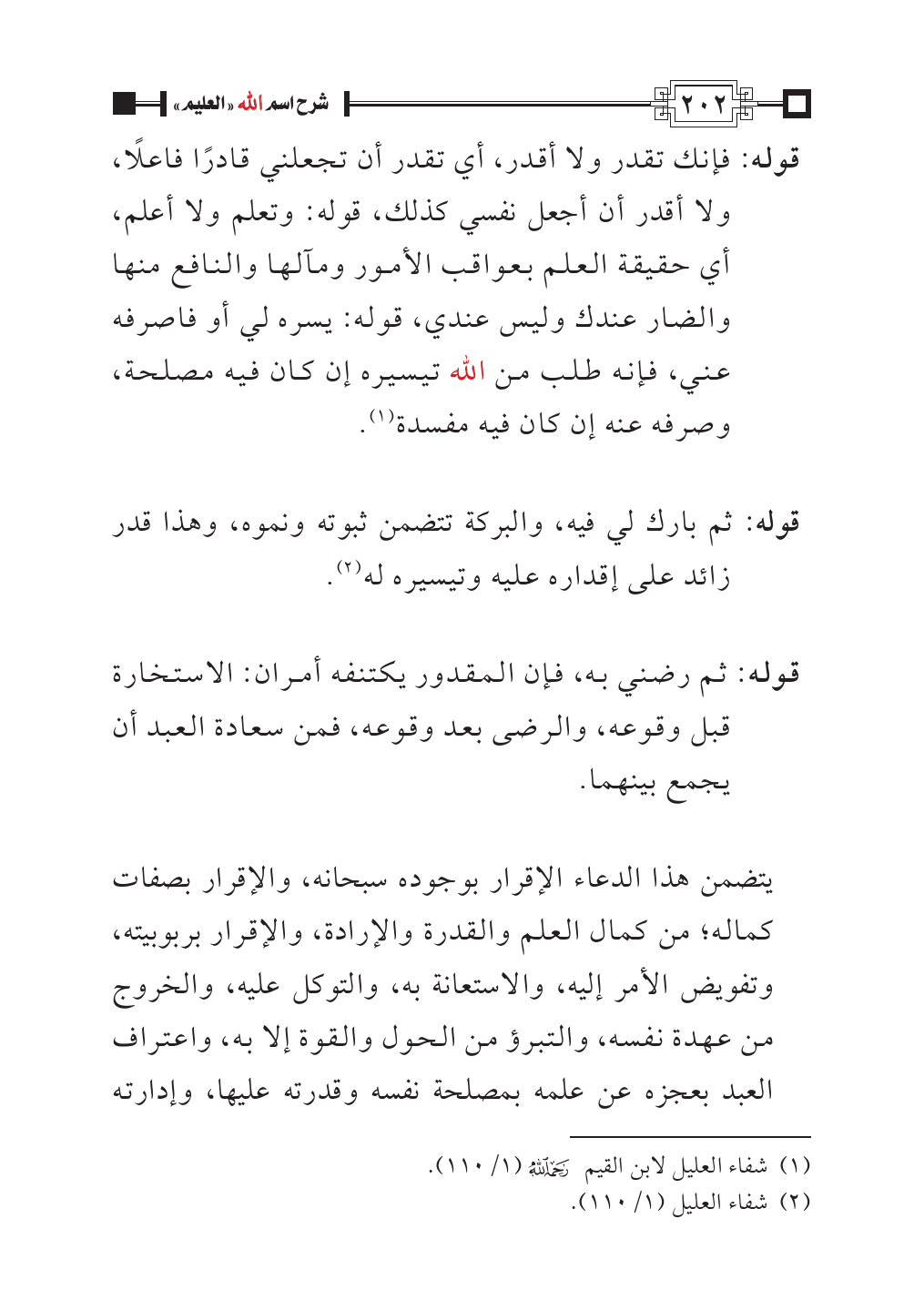 قوله: فإنك تقدر ولا أقدر، أي تقدر أن تجعلني قادرًا فاعلًا، ولا أقدر أن أجعل نفسي كذلك، قوله: وتعلم ولا أعلم، أي حقيقة العلم بعواقب الأمور ومآلها والنافع منها والضار عندك وليس عندي، قوله: يسره لي أو فاصرفه عني، فإنه طلب من الله تيسيره إن كان فيه مصلحة، وصرفه عنه إن كان فيه مفسدة (¬١).