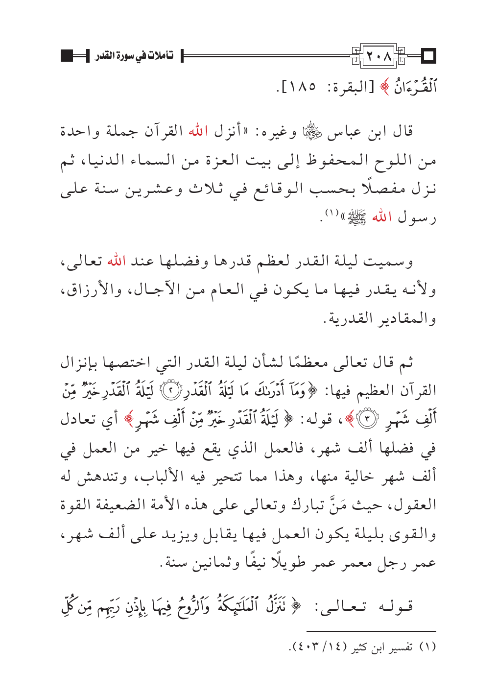 قال ابن عباس - رضي الله عنهما - وغيره: «أنزل الله القرآن جملة واحدة من اللوح المحفوظ إلى بيت العزة من السماء الدنيا، ثم نزل مفصلًا بحسب الوقائع في ثلاث وعشرين سنة على رسول الله - صلى الله عليه وسلم -» (¬١).