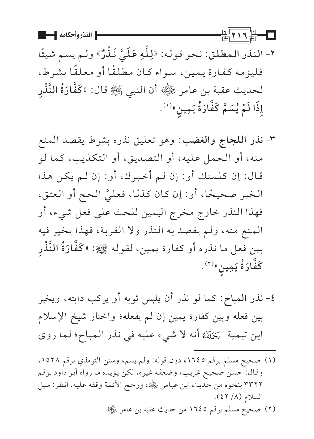 ٣ - نذر اللجاج والغضب: وهو تعليق نذره بشرط يقصد المنع منه، أو الحمل عليه، أو التصديق، أو التكذيب، كما لو قال: إن كلمتك أو: إن لم أخبرك، أو: إن لم يكن هذا الخبر صحيحًا، أو: إن كان كذبًا، فعليَّ الحج أو العتق، فهذا النذر خارج مخرج اليمين للحث على فعل شيء، أو المنع منه، ولم يقصد به النذر ولا القربة، فهذا يخير فيه بين فعل ما نذره أو كفارة يمين، لقوله - صلى الله عليه وسلم -: «كَفَّارَةُ النَّذْرِ كَفَّارَةُ يَمِينٍ» (¬٢).