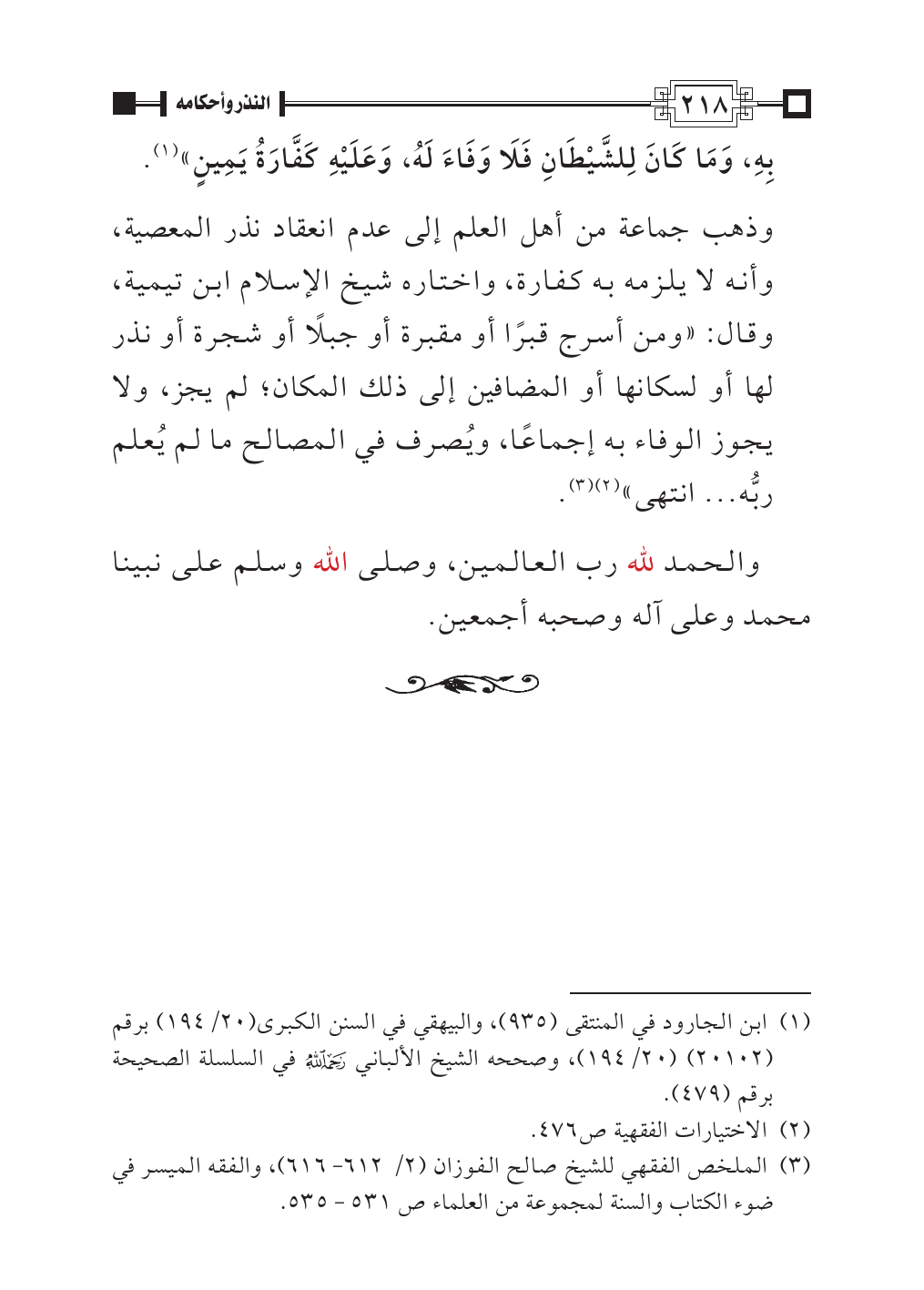 وذهب جماعة من أهل العلم إلى عدم انعقاد نذر المعصية، وأنه لا يلزمه به كفارة، واختاره شيخ الإسلام ابن تيمية، وقال: «ومن أسرج قبرًا أو مقبرة أو جبلًا أو شجرة أو نذر لها أو لسكانها أو المضافين إلى ذلك المكان؛ لم يجز، ولا يجوز الوفاء به إجماعًا، ويُصرف في المصالح ما لم يُعلم ربُّه ... انتهى» (¬٢) (¬٣).