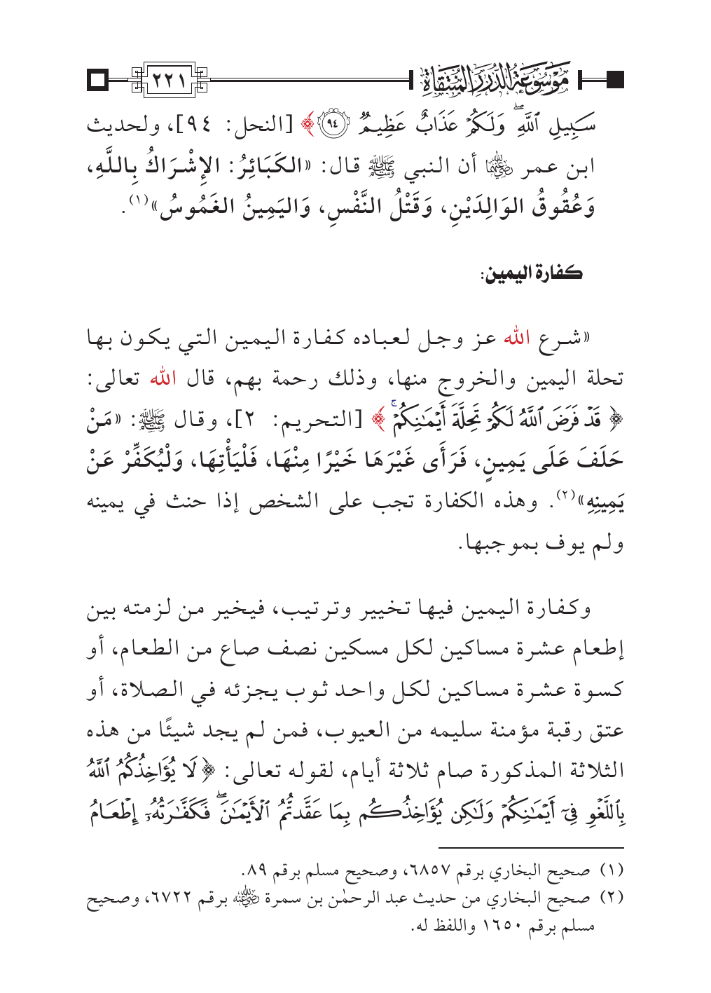 سَبِيلِ اللَّهِ وَلَكُمْ عَذَابٌ عَظِيمٌ (٩٤)} [النحل: ٩٤]، ولحديث ابن عمر - رضي الله عنهما - أن النبي - صلى الله عليه وسلم - قال: «الكَبَائِرُ: الإِشْرَاكُ بِاللَّهِ، وَعُقُوقُ الوَالِدَيْنِ، وَقَتْلُ النَّفْسِ، وَاليَمِينُ الغَمُوسُ» (¬١).