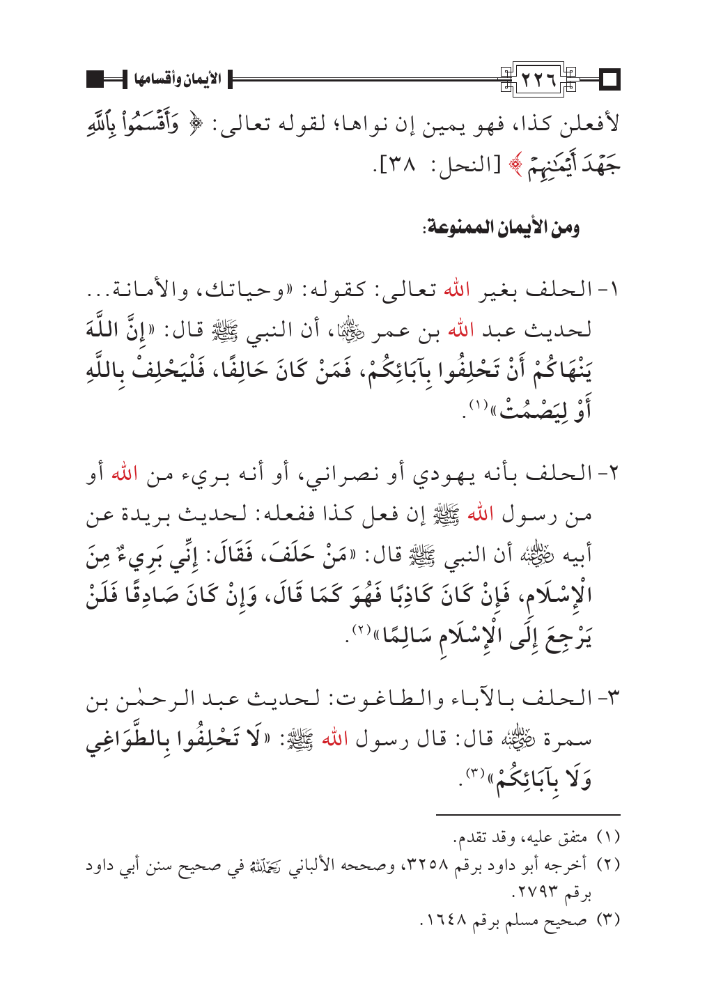 ٣ - الحلف بالآباء والطاغوت: لحديث عبد الرحمن بن سمرة - رضي الله عنه - قال: قال رسول الله - صلى الله عليه وسلم -: «لَا تَحْلِفُوا بِالطَّوَاغِي وَلَا بِآبَائِكُمْ» (¬٣).