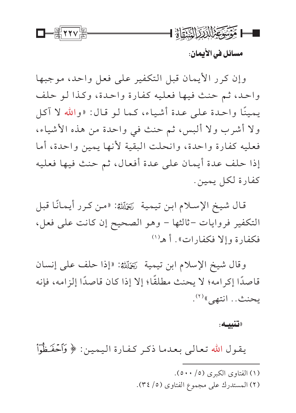 قال شيخ الإسلام ابن تيمية - رحمه الله -: «من كرر أيمانًا قبل التكفير فروايات -ثالثها - وهو الصحيح إن كانت على فعل، فكفارة وإلا فكفارات». أ هـ (¬١)