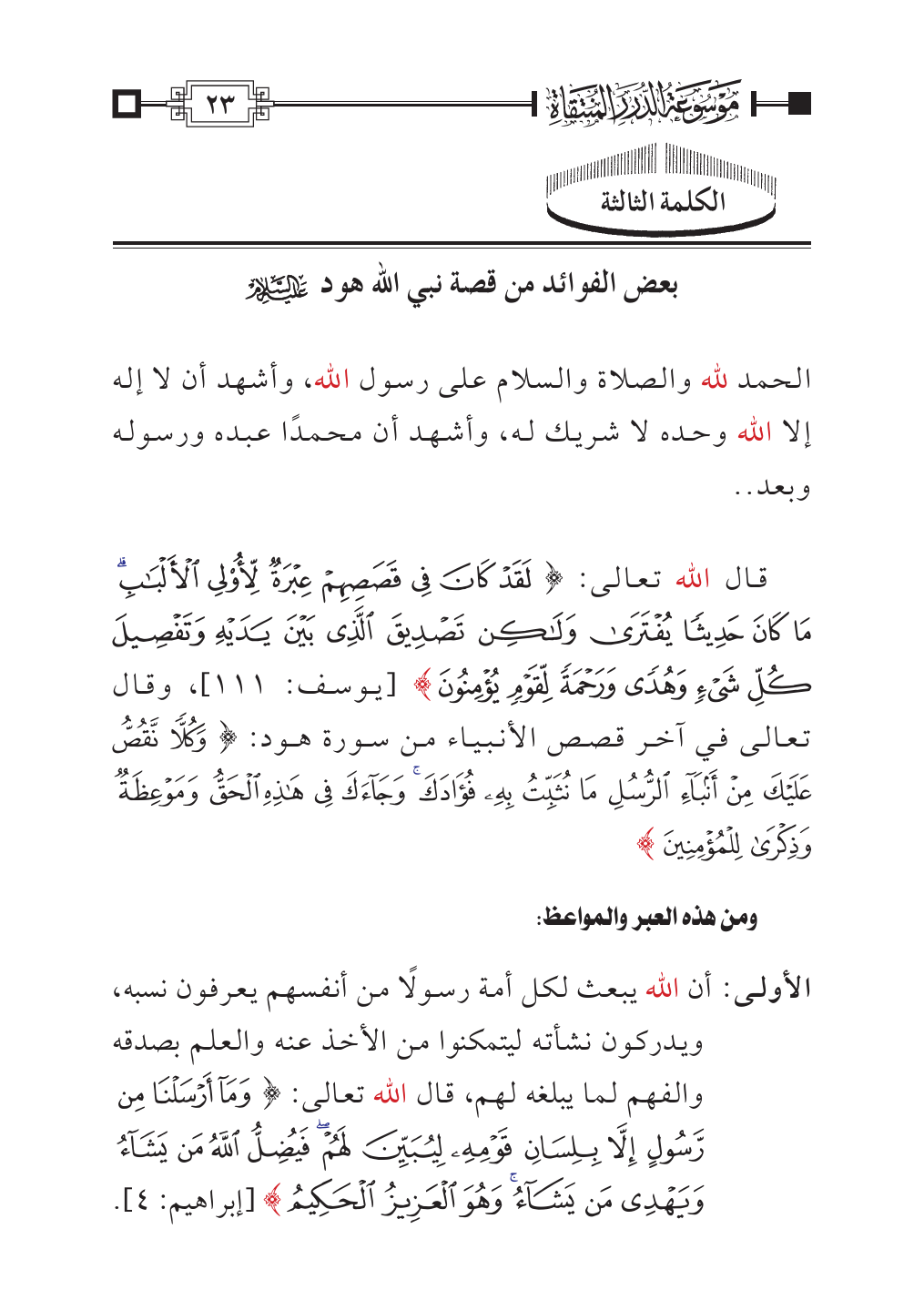 بعض الفوائد من قصة نبي الله هود - عليه السلام -