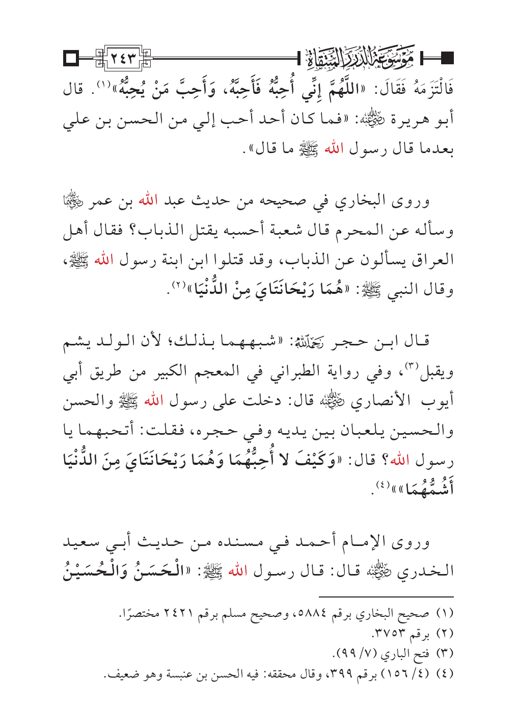 وروى الإمام أحمد في مسنده من حديث أبي سعيد الخدري - رضي الله عنه - قال: قال رسول الله - صلى الله عليه وسلم -: «الْحَسَنُ وَالْحُسَيْنُ