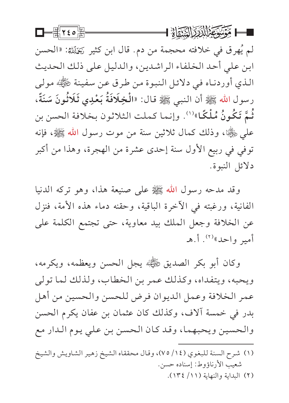 وقد مدحه رسول الله - صلى الله عليه وسلم - على صنيعة هذا، وهو تركه الدنيا الفانية، ورغبته في الآخرة الباقية، وحقنه دماء هذه الأمة، فنزل عن الخلافة وجعل الملك بيد معاوية، حتى تجتمع الكلمة على أمير واحد» (¬٢). أ. هـ